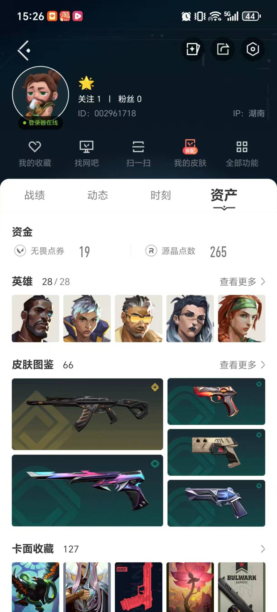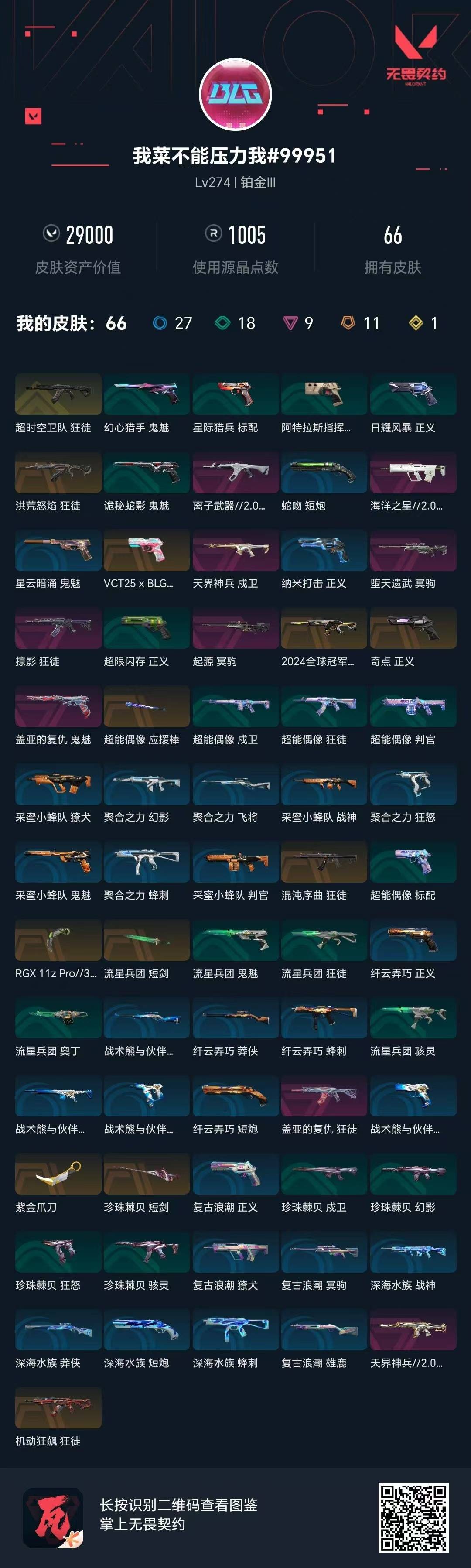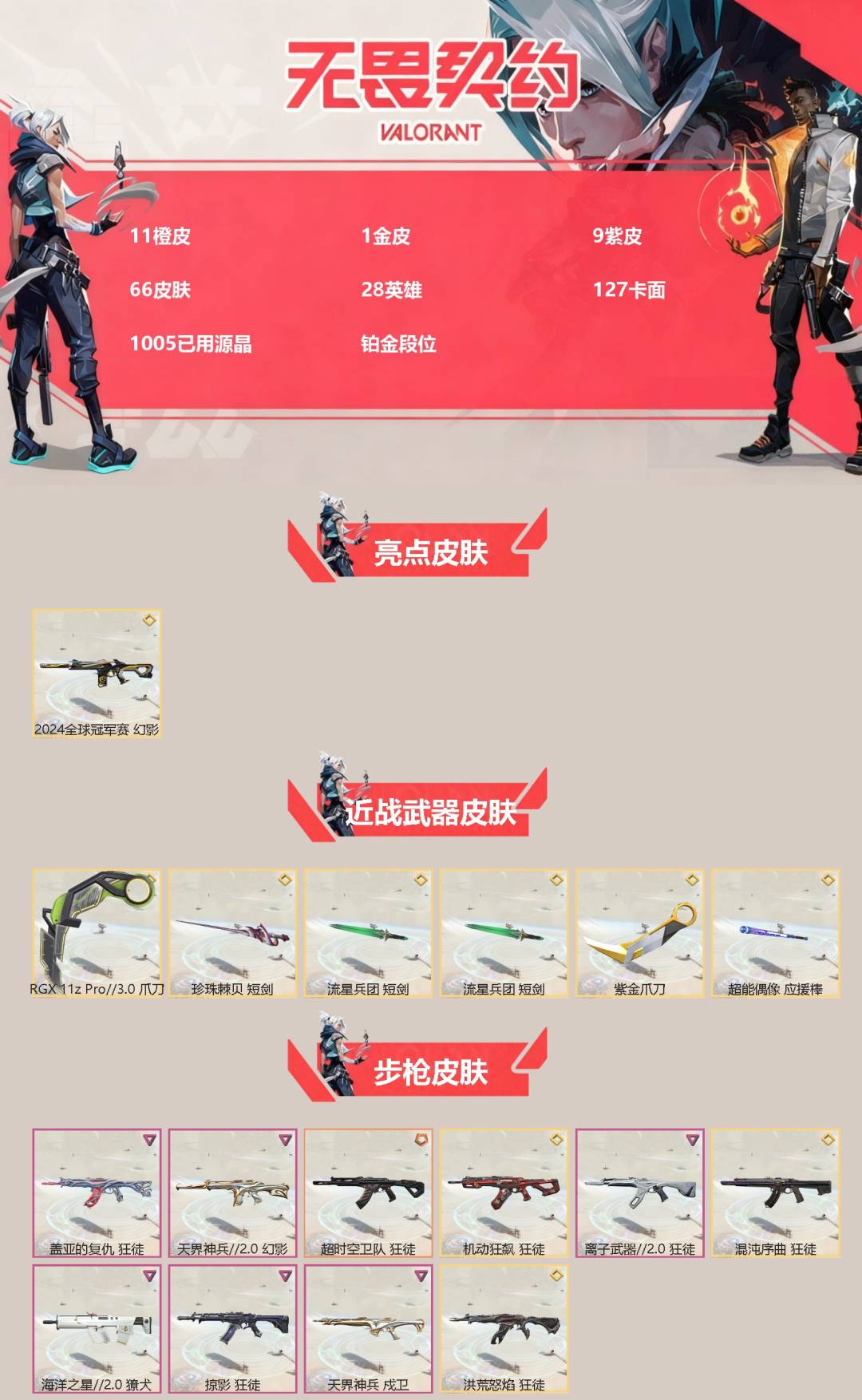 [16459981]11橙皮 1金皮 9紫皮 66皮肤 28英雄 127卡面 1005已用源晶 铂金段位 【亮点皮肤】幻影-2024全球冠军赛 【近战武器皮肤】短剑-流星兵团紫金爪刀爪刀-rgx 11z pro 3.0短剑-珍珠棘贝超能偶像 应援棒 【佩呛皮肤】标配-vct25xblg正