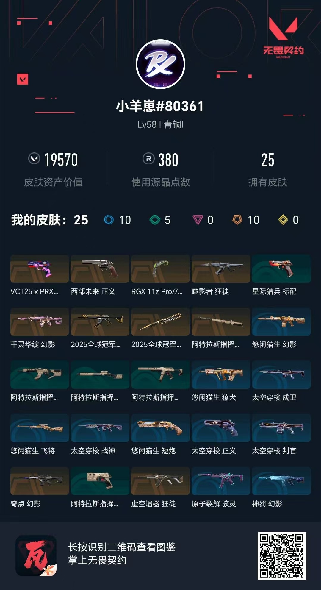 [16463442]10橙皮 25皮肤 18英雄 42卡面 380已用源晶 青铜段位 【套装】:2025全球冠军赛 【近战武器皮肤】:2025全球冠军赛 蝴蝶刀阿特拉斯指挥部爪刀-rgx 11z pro 3.0 【佩呛皮肤】:标配-vct25xprx正义-西部未来 【步呛皮肤】:狂徒-虚空遗