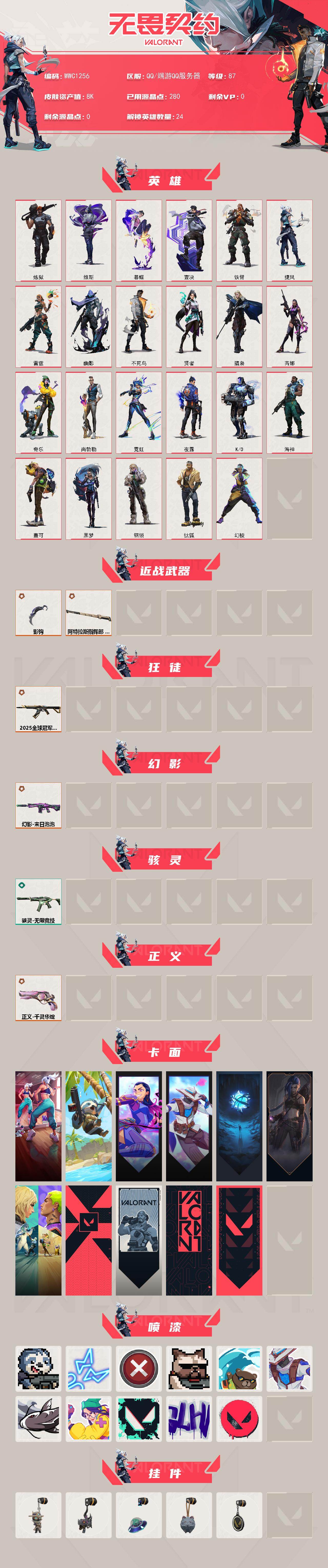 【wwc1256】终极5/皮肤20/等级87/段位:黄金/幻棱/炼狱/维斯/暮蝶/钛狐/壹决/铁臂/捷风/雷兹/幽影/不死鸟/贤者/猎枭/芮娜/奇乐/尚勃勒/霓虹/夜露/k/o/海神/盖可/黑梦/钢锁/近战武器-影钩/近战武器-阿特拉斯指挥部 甩棍/狂徒-2025全球冠军赛/幻影-末日泡泡/骇灵-无限竞技/正义-千灵华绽/热舞环节 卡面/树懒大作战 卡面/无畏契约go!第一卷:芮娜 卡面