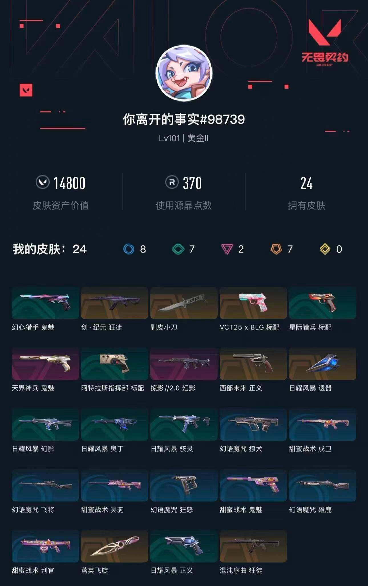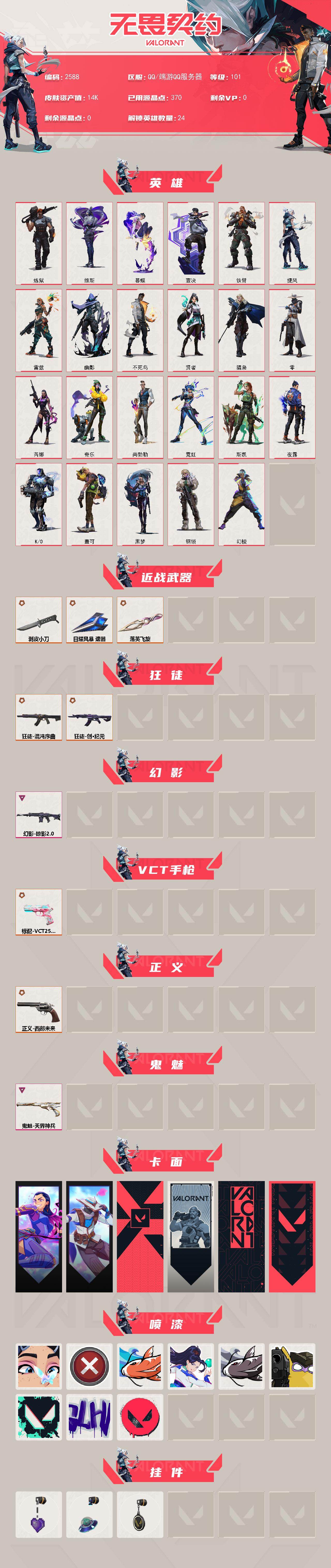 [16586177]【英雄】:幻棱,炼狱,维斯,暮蝶,壹决,铁臂,捷风,雷兹,幽影,不死鸟,贤者,猎枭,零,芮娜,奇乐,尚勃勒,霓虹,斯凯,夜露,k/o,盖可,黑梦,钢锁 【近战武器】:近战武器-剥皮小刀,近战武器-落英飞旋,近战武器-日耀风暴 遗器 【狂徒】:狂徒-混沌序曲,狂徒-创·纪元 【幻影】:幻影-掠影//2.0 【vct手呛】:标配-vct25 x blg 【正义】:正义-西部未来 【鬼魅】:鬼魅-天界神兵 【卡面】:无畏契约go!第一卷:芮娜 卡面,无畏契约go!第一卷:零 卡面,代号红色 卡面,新兵报到 卡面,v契约 卡面,无畏契约 卡面 【喷漆】:鼻尖上的蝴蝶 喷漆,买装还是存钱 喷漆,红鳞 喷漆,无畏契约go!第一卷:贤者 喷漆,松叶 喷漆,放下武器 喷漆,胜利属于无畏契约 喷漆,glhf 喷漆,无畏契约 喷漆 【挂饰】:薰衣草之心 挂饰,天外飞客 挂饰,无畏契约 纪念币 挂饰