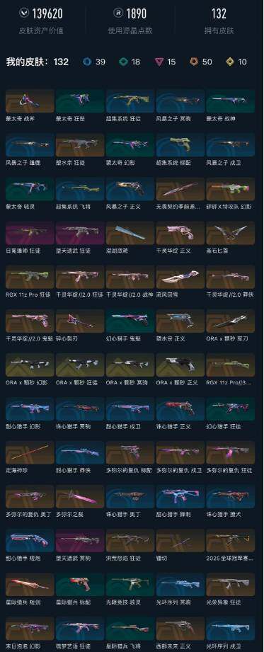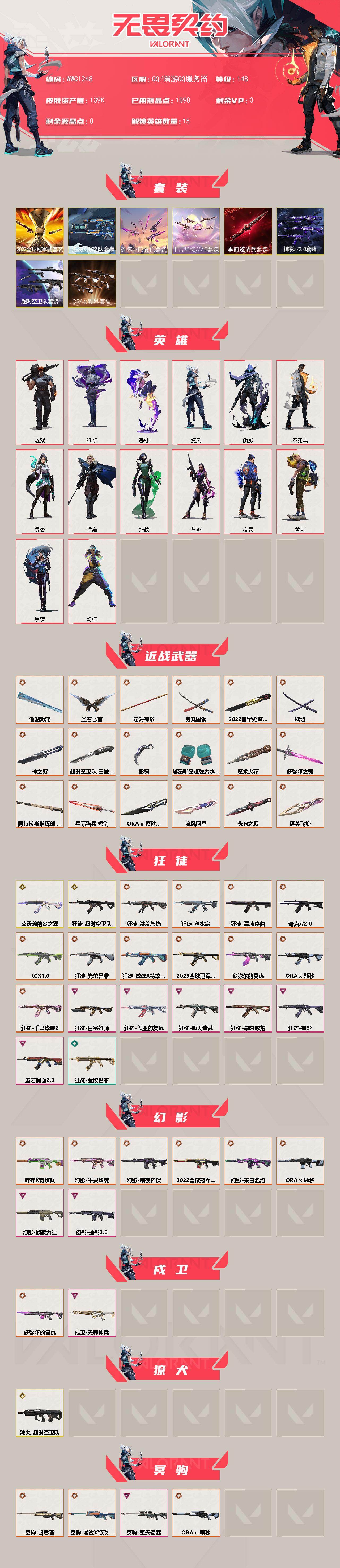 【wwc1248】终极50/传奇10/卓越15/皮肤132/等级148/段位:黄金/2022全球冠军赛套装/超时空卫队套装/无畏契约季前邀请赛套装/千灵华绽//2.0套装/a x 颗秒套装/多弥尔的复仇套装/滋滋x特攻队套装/掠影//2.0套装/幻棱/炼狱/维斯/暮蝶/捷风/幽影/不死鸟/贤者/猎枭/蝰蛇/芮娜/夜露/盖可/黑梦/近战武器-2022全球冠军赛 蝴蝶刀/近战武器-无