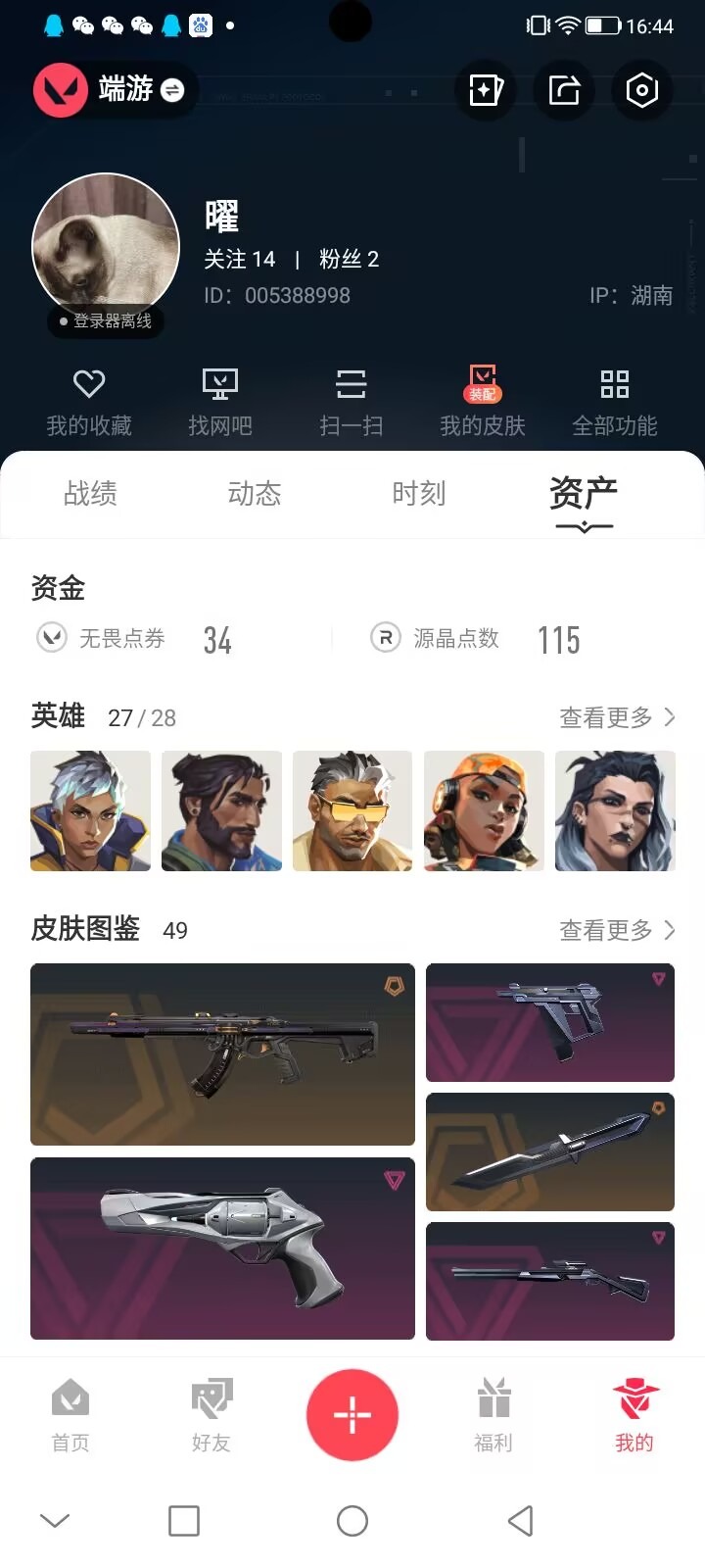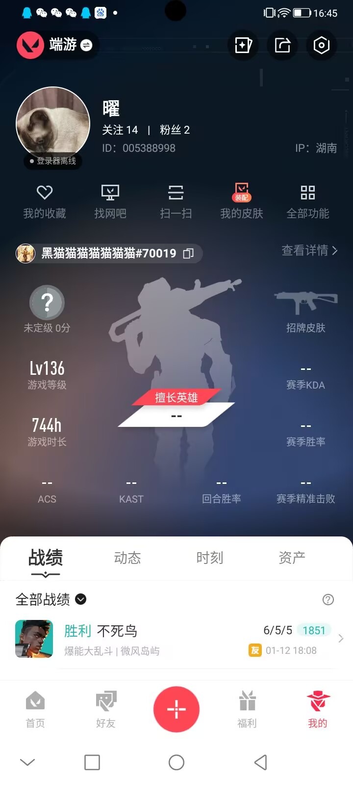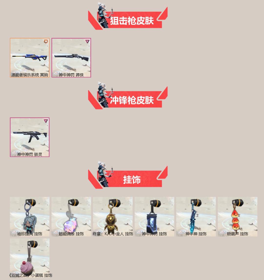 6橙皮 1金皮 6紫皮 49皮肤 27英雄 85卡面 715已用源晶 未定级段位 【套装】神罚套装神中神罚套装 【近战武器皮肤】匕首-超限闪存神之刃诡秘蛇影超能偶像 应援棒 【佩呛皮肤】狂怒-神中神罚正义-离子武器 【冲锋呛皮肤】骇灵-神中神罚 【步呛皮肤】狂徒-奇点//2.0幻影-神