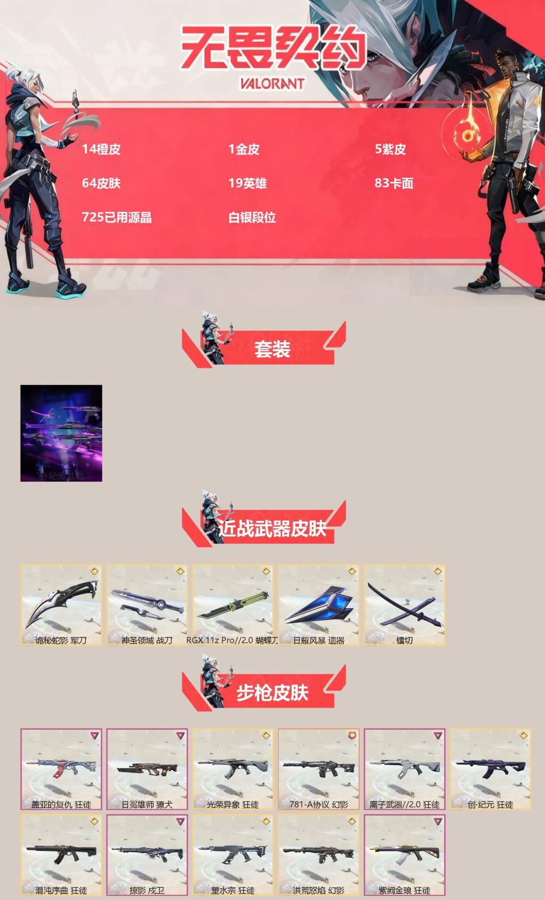 [16466137]14橙皮 1金皮 5紫皮 64皮肤 19英雄 83卡面 725已用源晶 白银段位 【套装】创·纪元套装 【近战武器皮肤】日耀风暴 遗器rgx 11z pro//2.0 蝴蝶刀诡秘蛇影神圣领域 战刀镭切 【佩呛皮肤】正义-西部未来正义-创·纪元 【冲锋呛皮肤】骇灵-创·