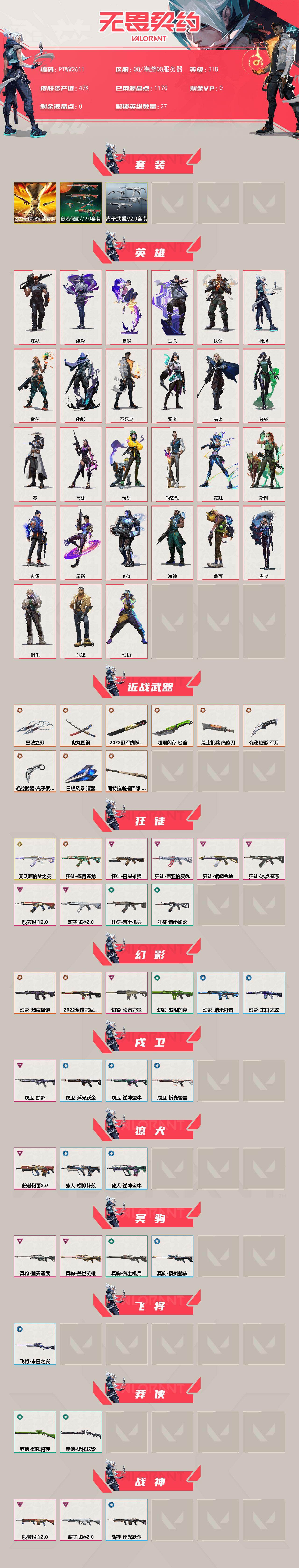 【ptww2611】终极12/传奇1/卓越20/皮肤100/等级318/段位:未定级/2022全球冠军赛套装/般若假面//2.0套装/离子武器//2.0套装/幻棱/炼狱/维斯/暮蝶/钛狐/壹决/铁臂/捷风/雷兹/幽影/不死鸟/贤者/猎枭/蝰蛇/零/芮娜/奇乐/尚勃勒/霓虹/斯凯/夜露/星礈/k/o/海神/盖可/黑梦/钢锁/近战武器-2022全球冠军赛 蝴蝶刀/黑波之刃/鬼丸国纲/近战