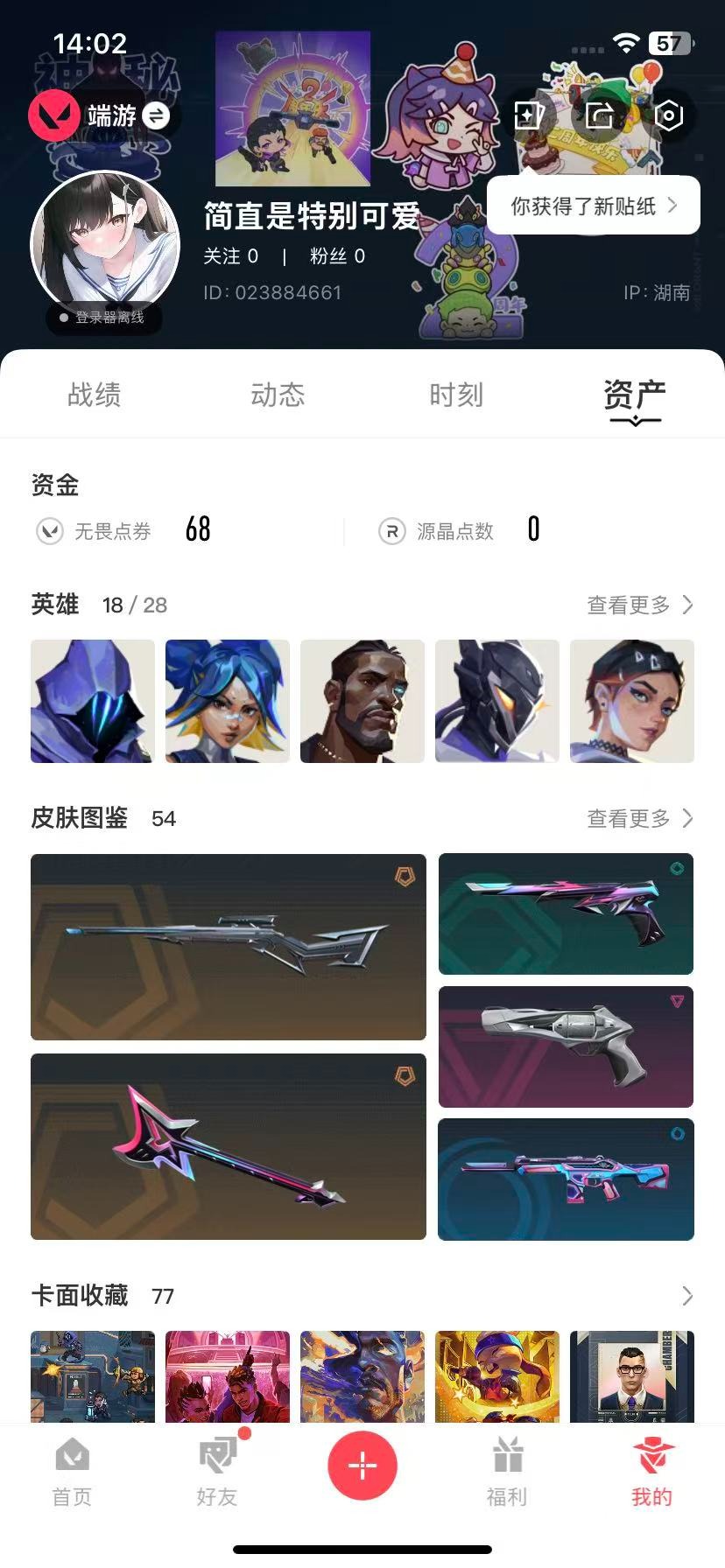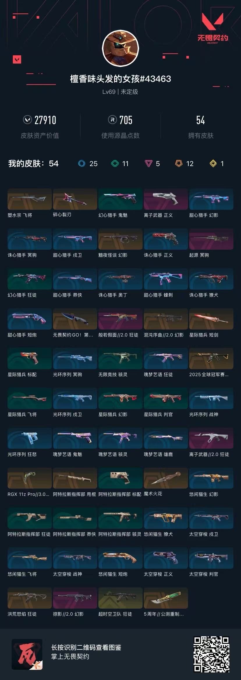 12橙皮 1金皮 5紫皮 54皮肤 18英雄 77卡面 705已用源晶 未定级段位 【近战武器皮肤】星际猎兵 短剑碎心裂刃魔术火花阿特拉斯指挥部匕首-无畏契约go!第三卷苍龙之刃爪刀-rgx 11z pro 3.0 【佩呛皮肤】正义-离子武器 【步呛皮肤】幻影-黯夜怪谈狂徒-离子武器