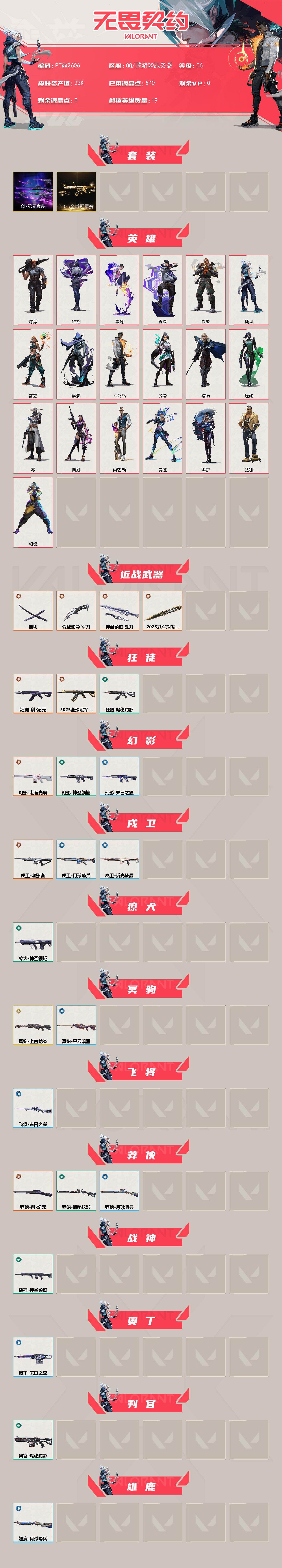 【ptww2606】终极12/传奇1/皮肤47/等级56/段位:未定级/2025全球冠军赛套装/创·纪元套装/幻棱/炼狱/维斯/暮蝶/钛狐/壹决/铁臂/捷风/雷兹/幽影/不死鸟/贤者/猎枭/蝰蛇/零/芮娜/尚勃勒/霓虹/黑梦/近战武器-2025全球冠军赛 蝴蝶刀/镭切/近战武器-诡秘蛇影 军刀/近战武器-神圣领域 战刀/狂徒-2025全球冠军赛/创·纪元-狂徒/狂徒-诡秘蛇影/幻影-电