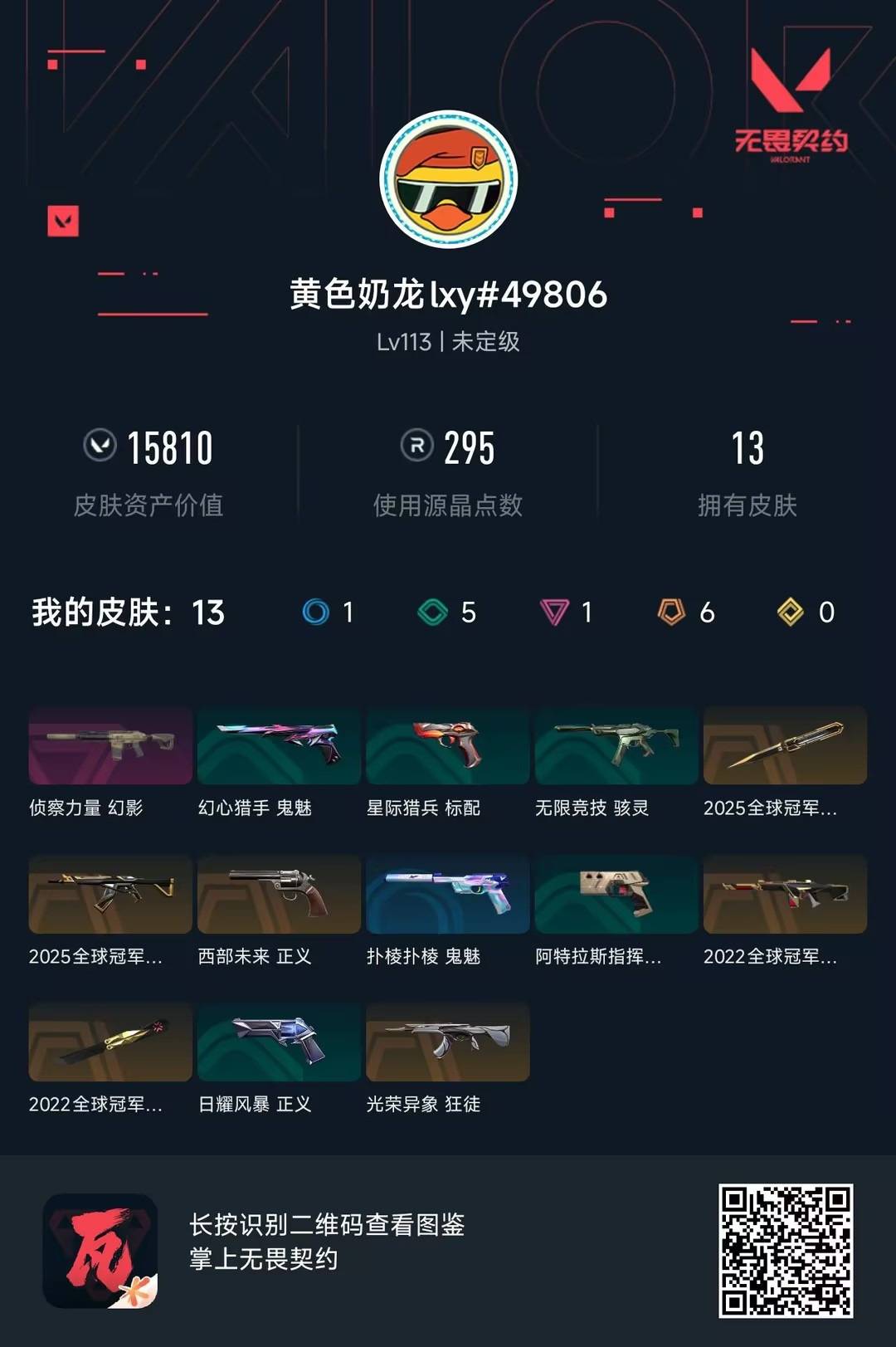 [16589842]6橙皮 1紫皮 13皮肤 21英雄 47卡面 295已用源晶 未定级段位 【亮点皮肤】幻影-2022全球冠军赛蝴蝶刀-2022全球冠军赛 【套装】2025全球冠军赛2022全球冠军赛 【近战武器皮肤】2025全球冠军赛 蝴蝶刀 【佩呛皮肤】正义-西部未来 【步呛皮肤】2025全球冠军赛 狂徒狂徒-光荣异象幻影-侦察力量 【挂饰】薰衣草之心挂饰双城之战魄罗挂饰2025全球冠军赛挂饰v25第三幕:黑铁 挂饰2022全球冠军赛弯檐帽挂饰金属蝶翼挂饰鱼骨头挂饰