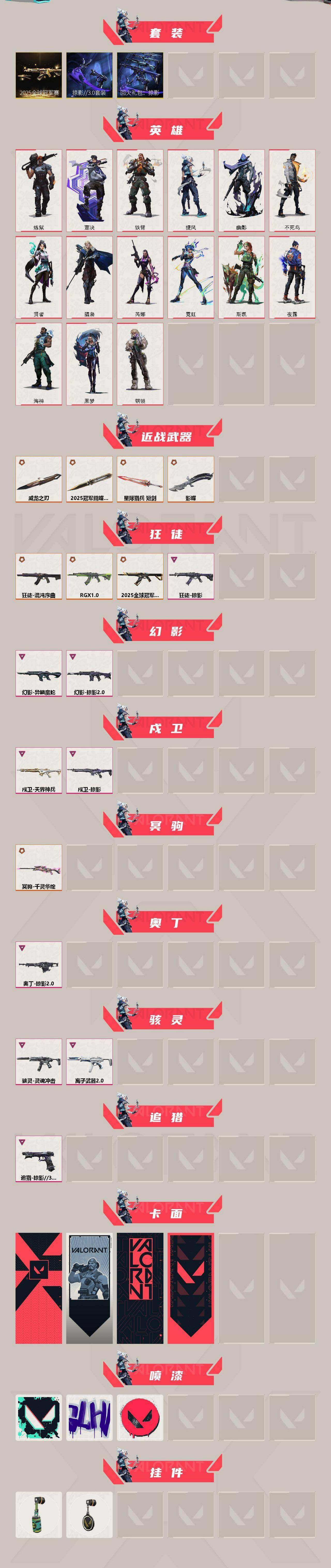 [16590105]k1300/可二次/【资产29010/营地id:026951709】【套装】:2025全球冠军赛套装,掠影//3.0套装,回火礼包:掠影套装【英雄】:炼狱,壹决,铁臂,捷风,幽影,不死鸟,贤者,猎枭,芮娜,霓虹,斯凯,夜露,海神,黑梦,钢【近战武器】:近战武器-2025全球冠军赛 蝴蝶刀,近战武器-影蝶,近战武器-威龙之刃,近战武器-星际猎兵 短剑【狂徒】:狂徒-2025全球冠军赛,狂徒-混沌序曲,狂徒-rgx 11z pro,狂徒-掠影【幻影】:幻影-异鳞魔蛇,幻影-掠影//2.0【戍卫】:戍卫-掠影,戍卫-天界神兵【冥驹】:冥驹-千灵华绽【奥丁】:奥丁-掠影//2.0【骇灵】:骇灵-灵魂冲击,骇灵-离子武器//2.【追猎】:追猎-掠影//3.0【卡面】:代号红色 卡面,新兵报到 卡面,v契约 卡面,无畏契约 卡面【喷漆】:胜利属于无畏契约 喷漆,glhf 喷漆,无畏契约 喷漆【挂饰】:z世代特饮 挂饰,无畏契约 纪念币 挂饰