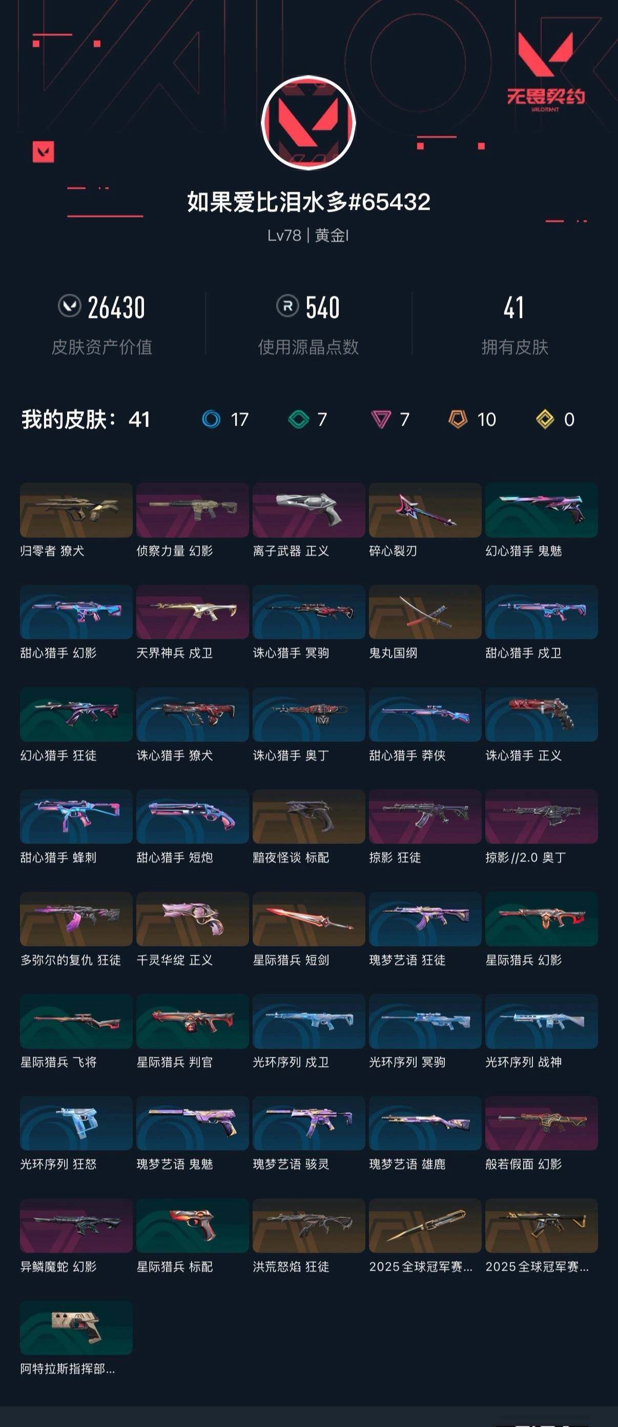 [16591612]【编号56439 可秒换绑】【质量拉满!25冠军套各类t0皮肤!手慢无!】 【套装】:2025全球冠军赛套装 【英雄】:幻棱,炼狱,暮蝶,壹决,铁臂,捷风,雷兹,不死鸟,贤者,猎枭,蝰蛇,零,芮娜,尚勃勒,霓虹,k/o,盖可,黑梦,钢锁 【近战武器】:近战武器-2025全球冠军赛 蝴蝶刀,近战武器-鬼丸国纲,近战武器-星际猎兵 短剑 【狂徒】:狂徒-2025全球冠军赛,狂徒-洪荒怒焰,狂徒-多弥尔的复仇,狂徒-掠影 【幻影】:幻影-般若假面,幻影-侦察力量,幻影-异鳞魔蛇 【戍卫】:戍卫-天界神兵 【獠犬】:獠犬-归零者 【奥丁】:奥丁-掠影//2.0 【标配】:标配-黯夜怪谈 【正义】:正义-千灵华绽,正义-离子武器 【卡面】:无畏契约go!第一卷:芮娜 卡面,无畏契约go!第一卷:零 卡面,代号红色 卡面,新兵报到 卡面,v契约 卡面,无畏契约 卡面 【喷漆】:买装还是存钱 喷漆,胜利属于无畏契约 喷漆,glhf 喷漆,无畏契约 喷漆 【挂饰】:超限闪存 挂饰,天外飞客 挂饰,无畏契约 纪念币 挂饰