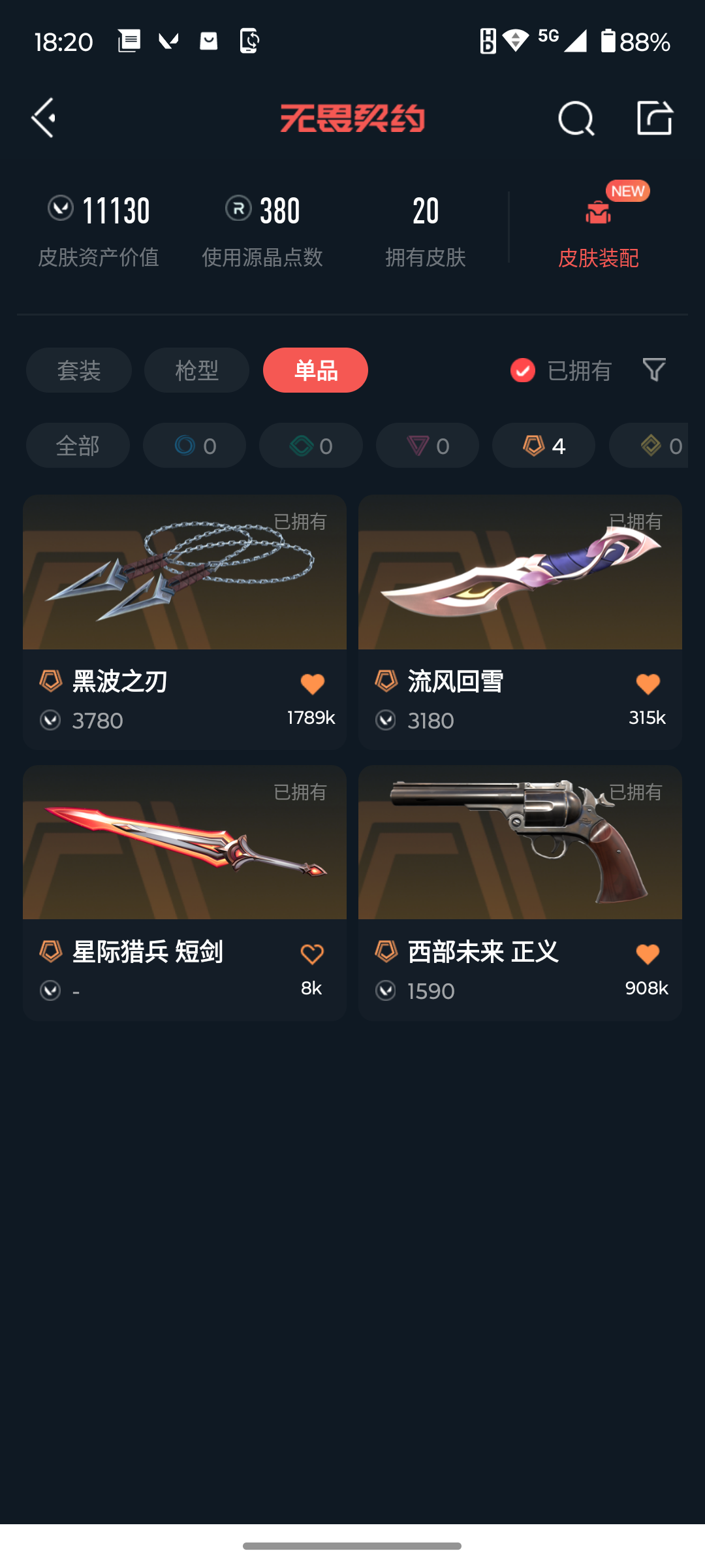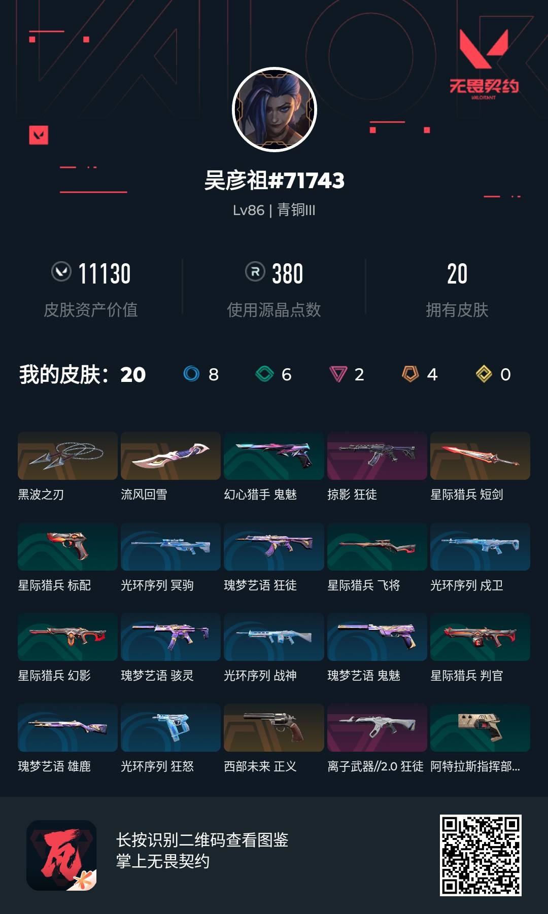 [16284771]s193155 无畏契约/86等级/青铜iii/20英雄/20皮肤/资产11130/已使用r点380/剩余r点100/离子武器//2.0-狂徒,掠影-狂徒,星际猎兵-短剑,流风回雪,黑波之刃,西部未来-正义