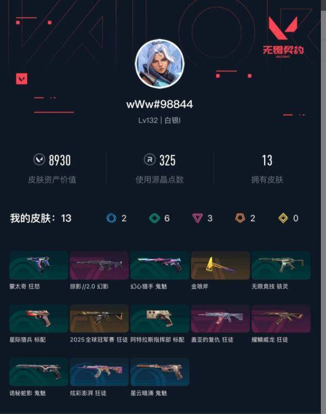 【wwqh242】终极2/卓越3/皮肤13/等级132/段位:白银/幻棱/炼狱/暮蝶/钛狐/壹决/捷风/不死鸟/贤者/猎枭/芮娜/尚勃勒/霓虹/斯凯/夜露/k/o/盖可/金琅斧/狂徒-2025全球冠军赛/盖亚的复仇-狂徒/狂徒-耀鳞威龙/狂徒-炫彩澎湃/幻影-掠影//2.0/骇灵-无限竞技/鬼魅-诡秘蛇影/鬼魅-星云暗涌/clutch 卡面/无畏契约go!第一卷:芮娜 卡面/无畏契约g