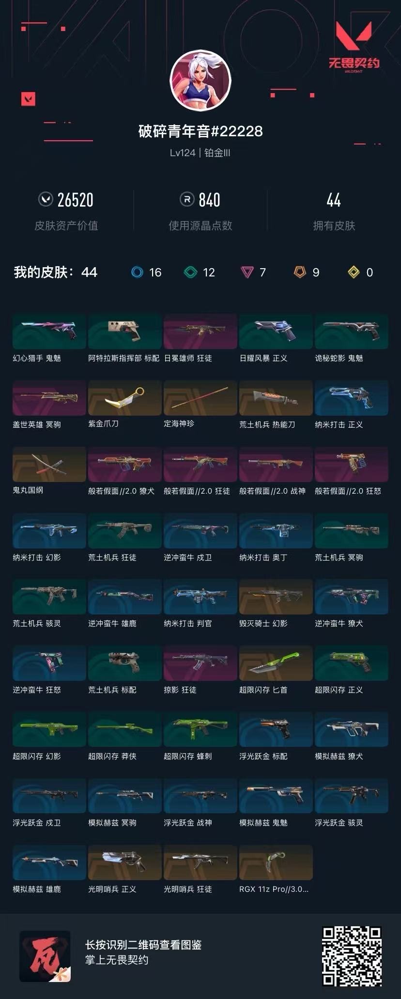 [16591952]9橙皮 7紫皮 44皮肤 28英雄 95卡面 840已用源晶 铂金段位 【套装】般若假面//2.0套装曲奇套装 【近战武器皮肤】鬼丸国纲荒土机兵热能刀匕首-超限闪存紫金爪刀爪刀-rgx 11z pro 3.0定海神珍 【佩呛皮肤】正义-光明哨兵狂怒-般若假面//2.0 【步呛皮肤】狂徒-光明哨兵獠犬-般若假面//2.0狂徒-般若假面//2.0幻影-毁灭骑士狂徒-掠影狂徒-日冕雄师 【狙击呛皮肤】冥驹-盖世英雄 【机呛皮肤】战神-般若假面//2.0 【挂饰】薰衣草之心挂饰神中神挂饰双城之战魄罗挂饰糖饼先生 挂饰双城之战小蛋糕挂饰蓄势待滚挂饰鱼骨头挂饰终章ko小金人挂饰飞刀挂饰