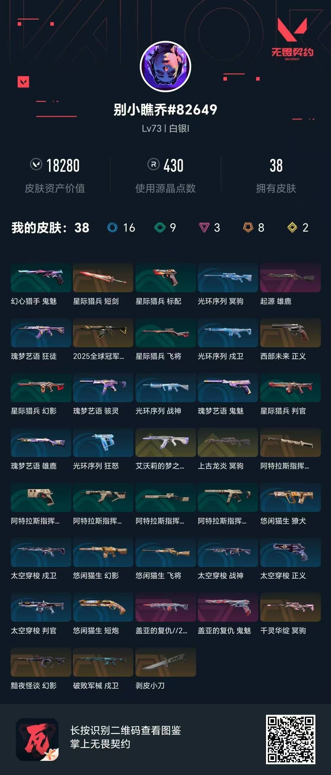 8橙皮 2金皮 3紫皮 38皮肤 19英雄 51卡面 430已用源晶 白银段位 【近战武器皮肤】阿特拉斯指挥部星际猎兵 短剑剥皮小刀 【佩呛皮肤】正义-西部未来鬼魅-盖亚的复仇 【霰弹呛皮肤】雄鹿-起源 【步呛皮肤】2025全球冠军赛 狂徒幻影-黯夜怪谈狂徒-艾沃莉的梦之翼戍卫-破败军