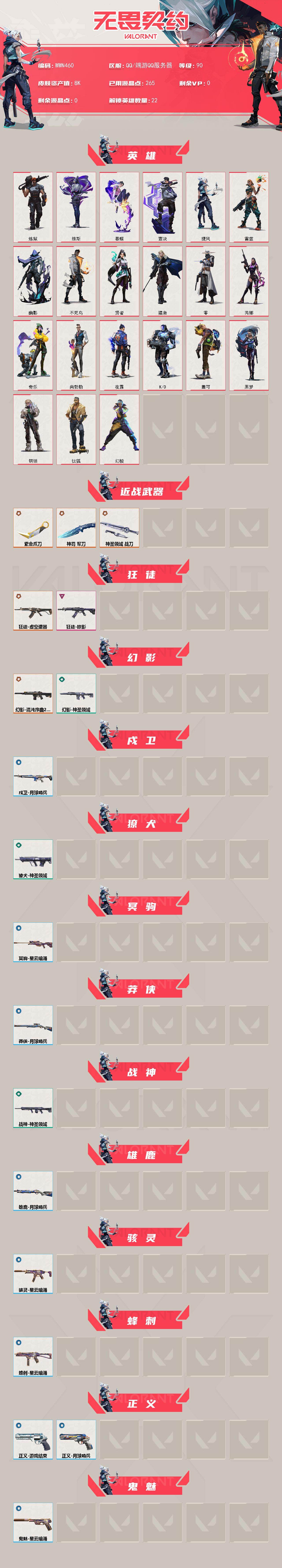 【wwn460】终极5/卓越1/皮肤22/等级90/段位:青铜/幻棱/炼狱/维斯/暮蝶/钛狐/壹决/捷风/雷兹/幽影/不死鸟/贤者/猎枭/零/芮娜/奇乐/尚勃勒/夜露/k/o/盖可/黑梦/钢锁/近战武器-紫金爪刀/近战武器-神罚 军刀/近战武器-神圣领域 战刀/狂徒-虚空遗器/狂徒-掠影/幻影-混沌序曲//2.0/幻影-神圣领域/戍卫-月球哨兵/獠犬-神圣领域/冥驹-星云暗涌/莽侠-月球哨兵/战神-神圣领域/雄鹿-月球哨兵/骇灵-星云暗涌/蜂刺-星云暗涌/正义-游戏结束/正义-月球哨兵/鬼魅-星云暗涌/狂怒-神圣领域/南瓜盛典 卡面/正义的化身 卡面/梦幻奶茶 卡面/无畏契约go!第一卷:芮娜 卡面/无畏契约go!第一卷:零 卡面/《双城之战》金克丝 卡面/代号红色 卡面/新兵报到 卡面/v契约 卡面/无畏契约 卡面/超级粉丝 喷漆/捷风差距 喷漆/倒吸一口凉气 喷漆/买装还是存钱 喷漆/胜利属于无畏契约 喷漆/glhf 喷漆/无畏契约 喷漆/无畏契约go!第一卷 芮娜 挂饰/无畏契约go!第一卷 零 挂饰/袖珍捷风 挂饰/天外飞客 挂饰/无畏契约 纪念币 挂饰