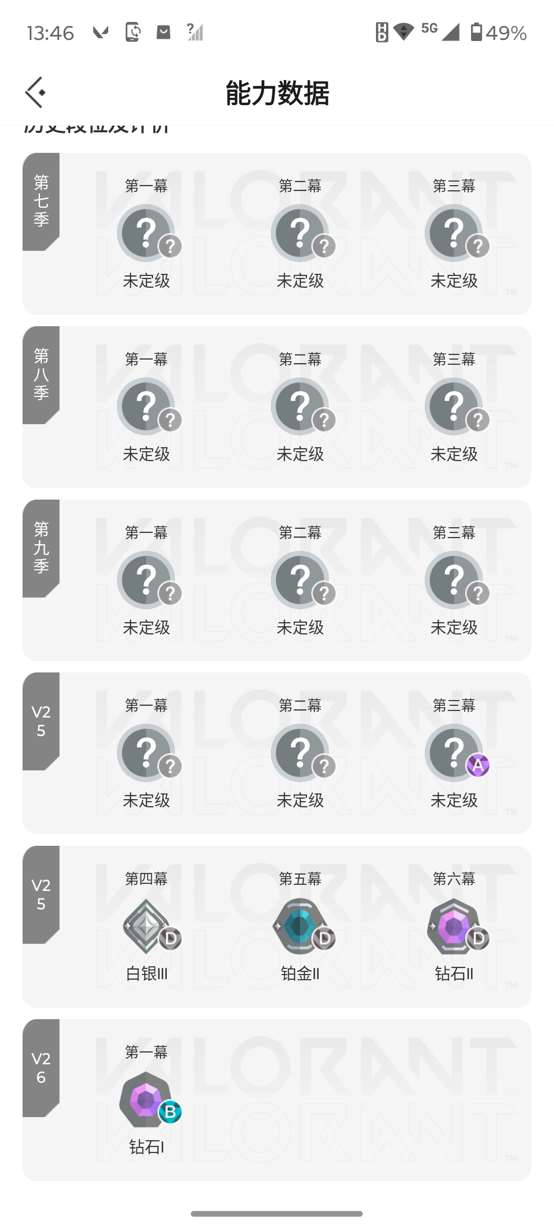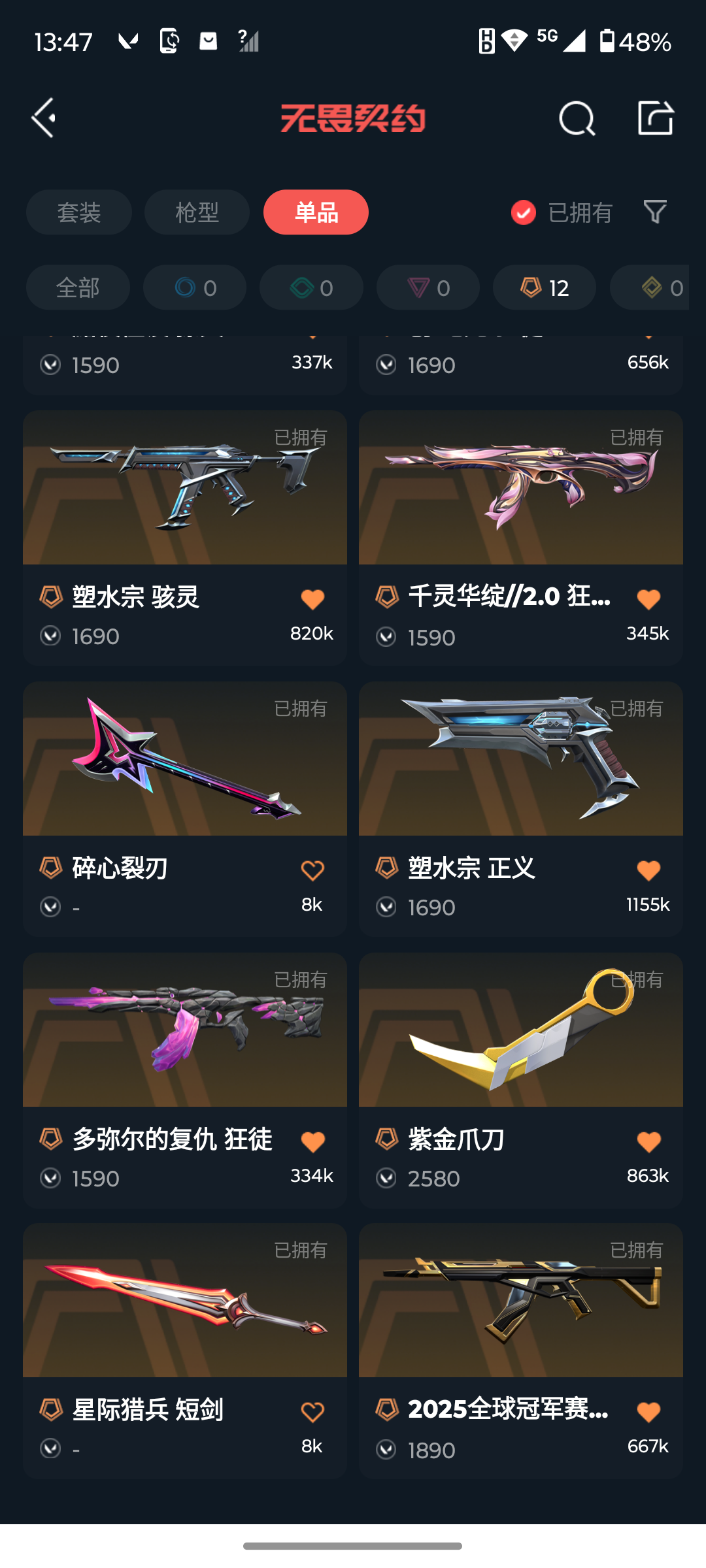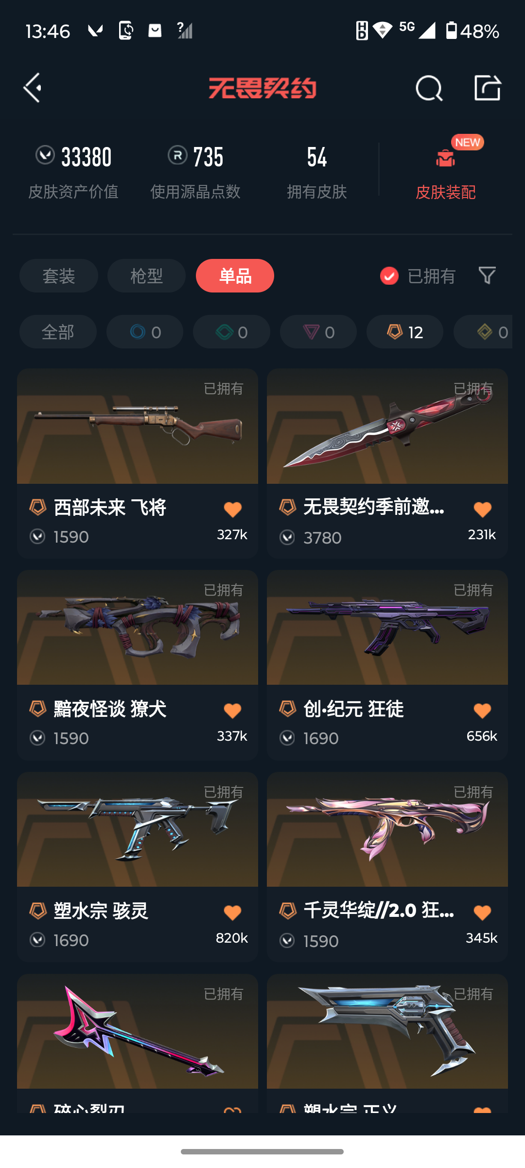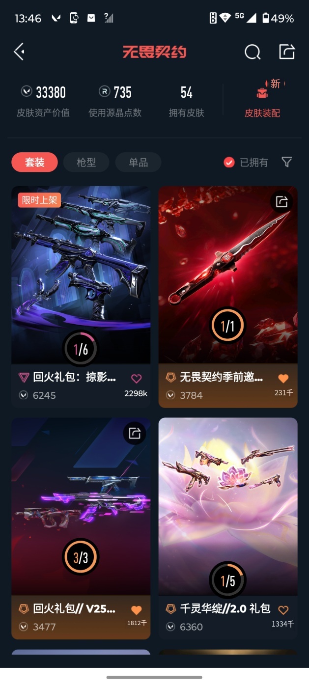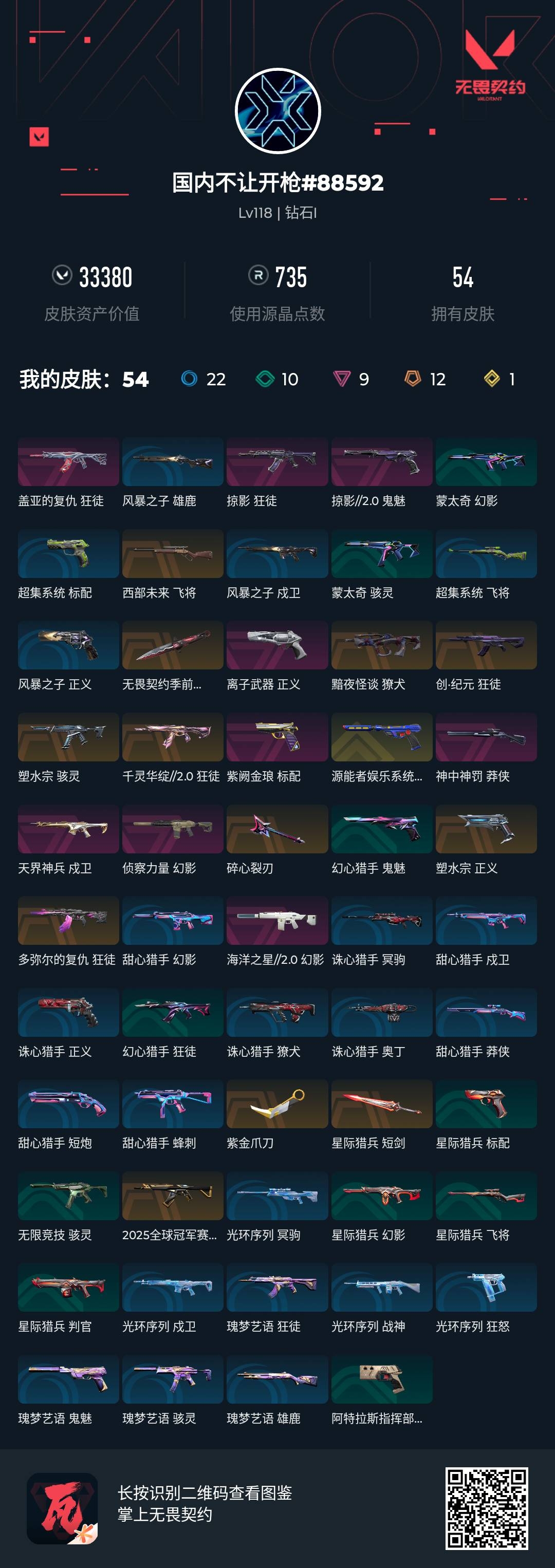 [16601115]l193485 无畏契约/118级/钻石i/24英雄/54皮肤/资产33380/已使用r点735/剩余r点0/无畏契约季前邀请赛-悲悯之刃,碎心裂刃,星际猎兵-短剑,紫金爪刀,多弥尔的复仇-狂徒,千灵华绽//2.0-狂徒,创·纪元-狂徒,黯夜怪谈-獠犬,2025全球冠军赛-狂徒,海洋之星//2.0-幻影,天界神兵-戍卫,盖亚的复仇-狂徒,侦察力量-幻影,掠影-狂徒,西部未来-飞将,神中神罚-莽侠,塑水宗-骇灵,塑水宗-正义,源能者娱乐系统-鬼魅,掠影//2.0-鬼魅,紫阙金琅-标配,离子武器-正义
