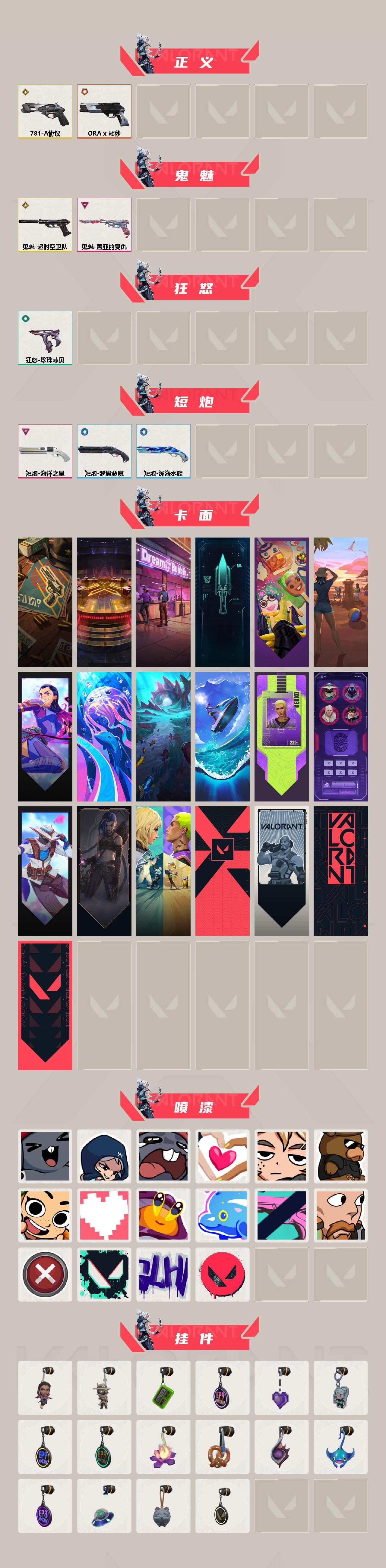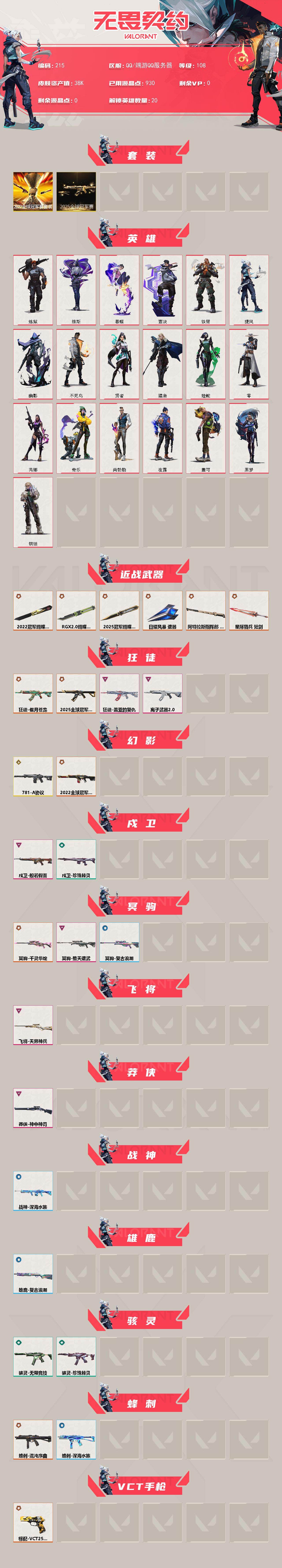 【215】【套装】:2025全球冠军赛套装,2022全球冠军赛套装 【英雄】:炼狱,维斯,暮蝶,壹决,铁臂,捷风,幽影,不死鸟,贤者,猎枭,蝰蛇,零,芮娜,奇乐,尚勃勒,夜露,盖可,黑梦,钢锁 【近战武器】:近战武器-2025全球冠军赛 蝴蝶刀,近战武器-2022全球冠军赛 蝴蝶刀,近战武器-rgx 11z pro//2.0 蝴蝶刀,近战武器-日耀风暴 遗器,近战武器-阿特拉斯指挥部 甩棍,近战武器-星际猎兵 短剑 【狂徒】:狂徒-2025全球冠军赛,狂徒-偃月苍龙,狂徒-盖亚的复仇,狂徒-离子武器//2.0 【幻影】:幻影-781-a协议,幻影-2022全球冠军赛 【戍卫】:戍卫-般若假面,戍卫-珍珠棘贝 【冥驹】:冥驹-千灵华绽,冥驹-堕天遗武,冥驹-复古浪潮 【飞将】:飞将-天界神兵 【莽侠】:莽侠-神中神罚 【战神】:战神-深海水族 【雄鹿】:雄鹿-复古浪潮 【骇灵】:骇灵-珍珠棘贝,骇灵-无限竞技 【蜂刺】:蜂刺-混沌序曲,蜂刺-深海水族 【vct手呛】:标配-vct25 x wol 【正义】:正义-781-a协议,正义-a x 颗秒 【鬼魅】:鬼魅-超时空卫队,鬼魅-盖亚的复仇 【狂怒】:狂怒-珍珠棘贝 【短炮】:短炮-海洋之星,短炮-梦魇恶魔,短炮-深海水族 【卡面】:正义的化身 卡面,最高舞台 卡面,梦幻奶茶 卡面,零点嗅探设计图 卡面,瓦娃脸雪糕 卡面 ,沙雕爆能器 卡面,无畏契约go!第一卷:芮娜 卡面,深海水族 卡面,珍珠棘贝 卡面,复古浪潮 卡面,盖可工牌 卡面,清除名单 卡面,无畏契约go!第一卷:零 卡面,《双城之战》金克丝 卡面,钢锁vs盖可 卡面,代号红色 卡面,新兵报到 卡面,v契约 卡面,无畏契约 卡面,暗潮 卡面 【喷漆】:超级粉丝 喷漆,捷风差距 喷漆,我的刀呢? 喷漆,双人比心 喷漆,不予置评 喷漆,三熊合一 喷漆,要喝完噢! 喷漆,双击点赞 喷漆,珍珠棘贝 喷漆,深海水族 喷漆,禁止标配 喷漆 ,铁臂尴尬 喷漆,买装还是存钱 喷漆,胜利属于无畏契约 喷漆,glhf 喷漆,无畏契约 喷漆 【挂饰】:无畏契约go!第一卷 芮娜 挂饰,无畏契约go!第一卷 零 挂饰,超限闪存 挂饰,第九季//第二幕 纪念币 挂饰,薰衣草之心 挂饰,袖珍捷风 挂饰,第九季//第一幕 纪念币 挂饰,第八季//第三幕 纪念币 挂饰,传世莲华 挂饰,扭结饼干 挂饰 ,珍珠棘贝 挂饰,深海水族 挂饰 ,第八季//第二幕 纪念币 挂饰 ,天外飞客 挂饰,《双城之战》魄罗 挂饰,无畏契约 纪念币 挂饰