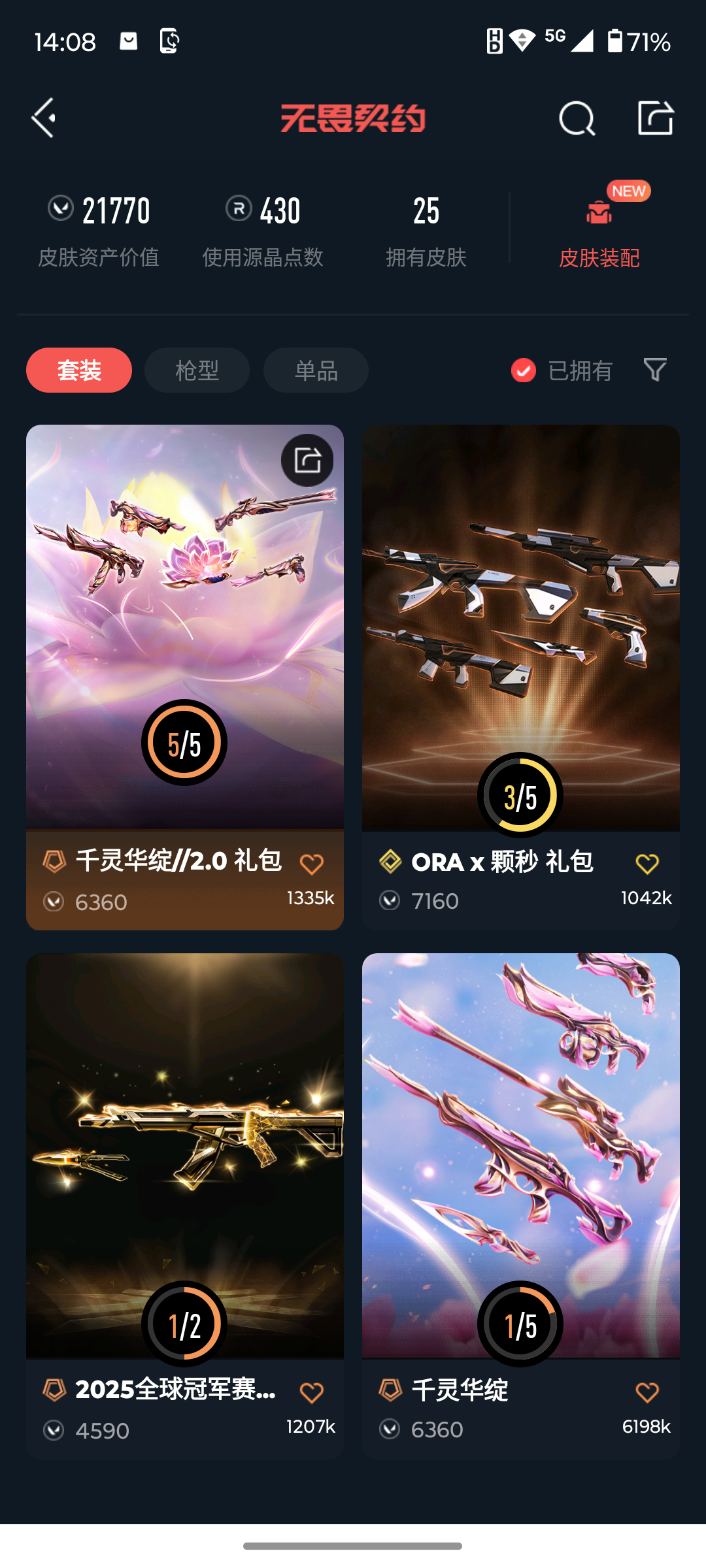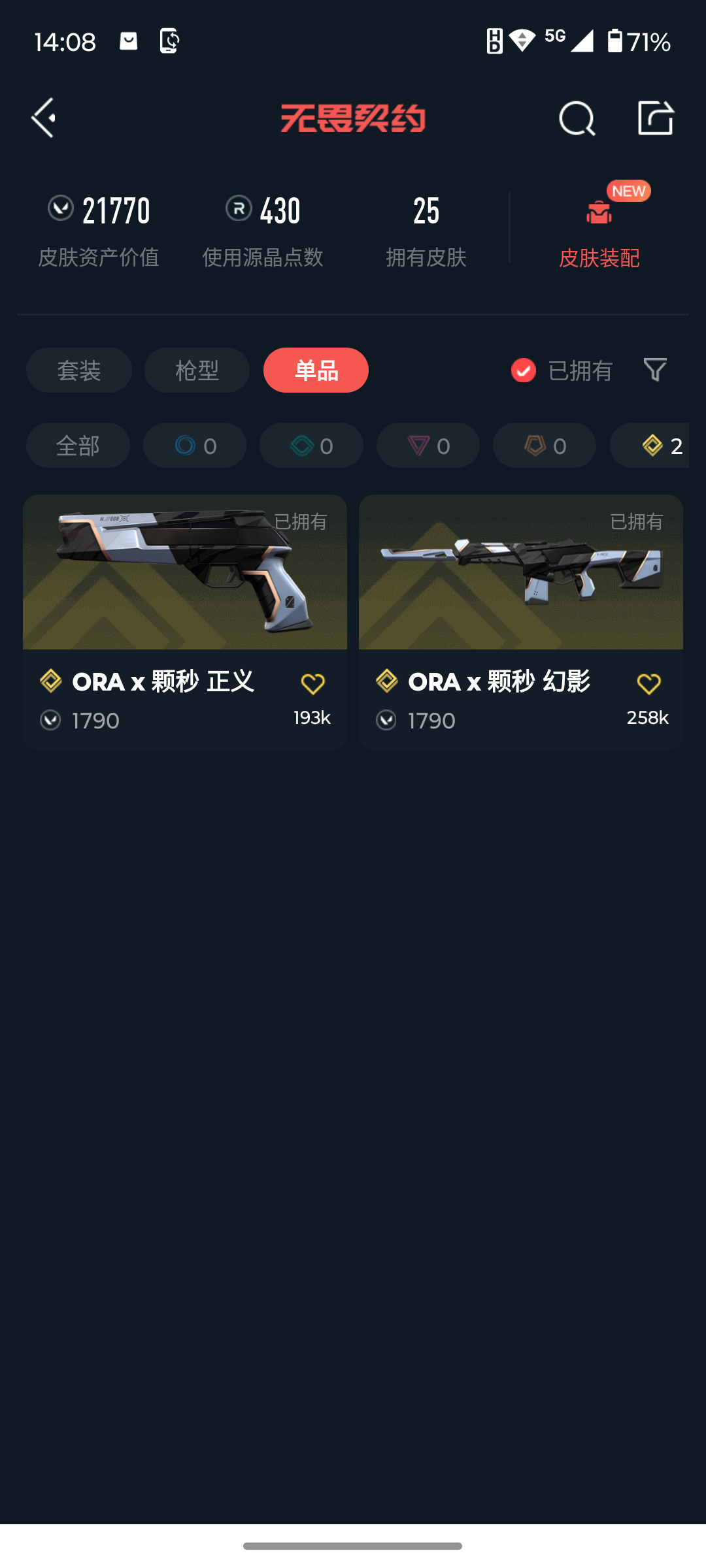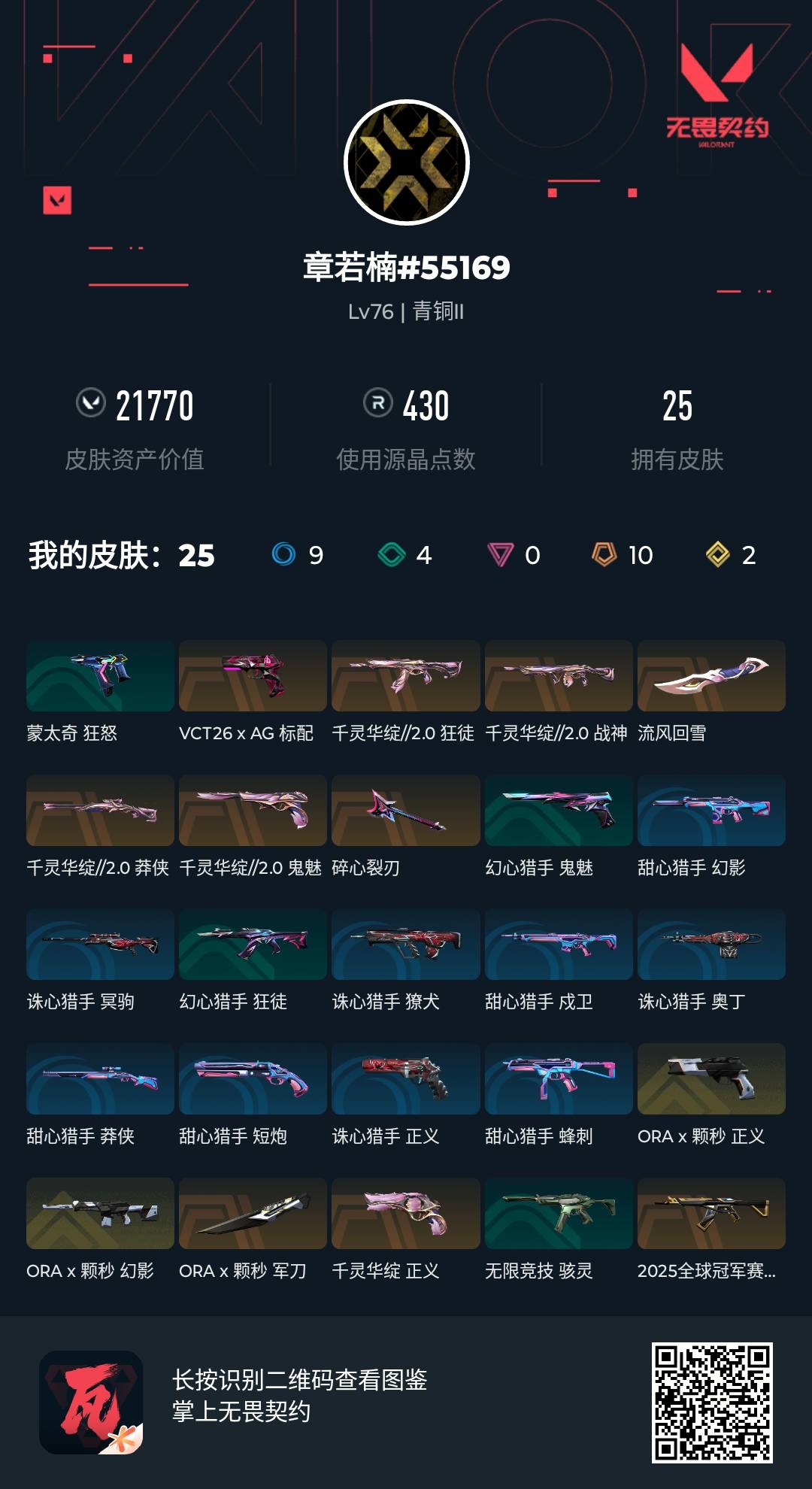 [16601811]l193487 (千灵华绽//2.0套装)无畏契约/76级/青铜i/23英雄/25皮肤/资产21770/已使用r点430/剩余r点35/碎心裂刃,a-x-颗秒-军刀,流风回雪,千灵华绽//2.0-狂徒,千灵华绽//2.0-战神,千灵华绽//2.0-莽侠,千灵华绽//2.0-鬼魅,2025全球冠军赛-狂徒,a-x-颗秒-幻影,vct26-x-ag-标配,千灵华绽-正义,a-x-颗秒-正义