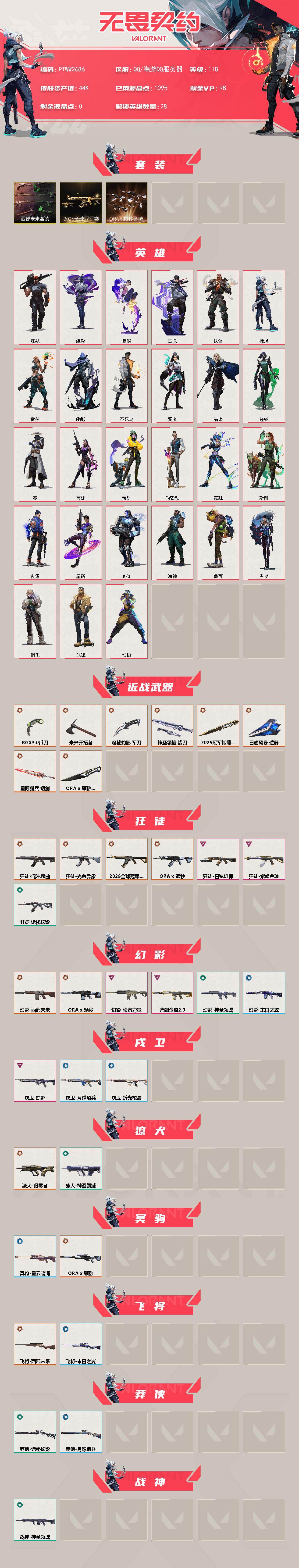 【套装】:2025全球冠军赛套装,a x 颗秒套装,西部未来套装 【英雄】:幻棱,炼狱,维斯,暮蝶,钛狐,壹决,铁臂,捷风,雷兹,幽影,不死鸟,贤者,猎枭,蝰蛇,零,芮娜,奇乐,尚勃勒,霓虹,斯凯,夜露,星礈,k/o,海神,盖可,黑梦,钢锁 【近战武器】:近战武器-2025全球冠军赛 蝴蝶刀,近战武器-a x 颗秒 军刀,近战武器-rgx 11z pro//3.0 爪刀,近战武器-未来