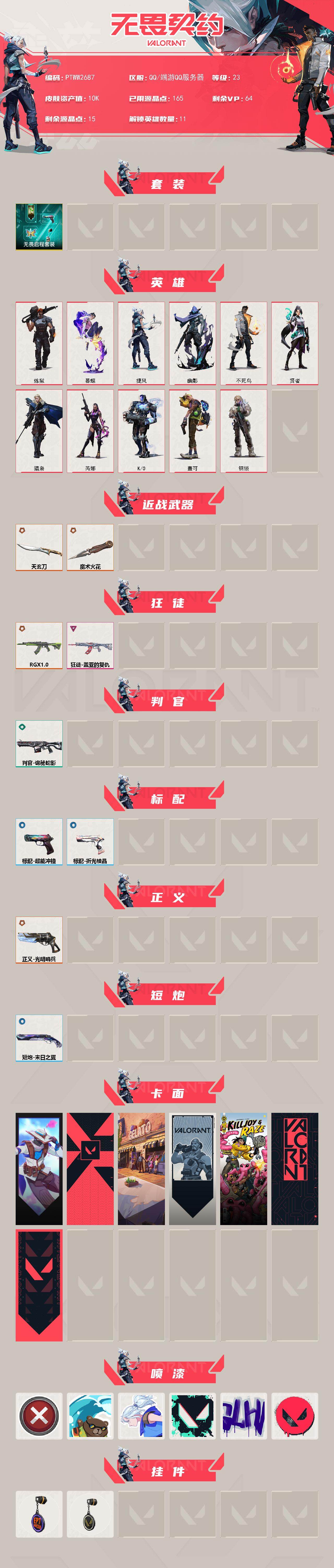 【套装】:无畏启程套装 【英雄】:炼狱,暮蝶,捷风,幽影,不死鸟,贤者,猎枭,芮娜,k/o,盖可,钢锁 【近战武器】:近战武器-魔术火花,近战武器-天玄刀,近战武器-魔术火花 【狂徒】:狂徒-rgx 11z pro,狂徒-盖亚的复仇 【判官】:判官-诡秘蛇影 【标配】:标配-超能冲撞,标配-折光棱晶 【正义】:正义-光明哨兵 【短炮】:短炮-末日之翼 【卡面】:无畏契约go!第一卷:零 卡面,