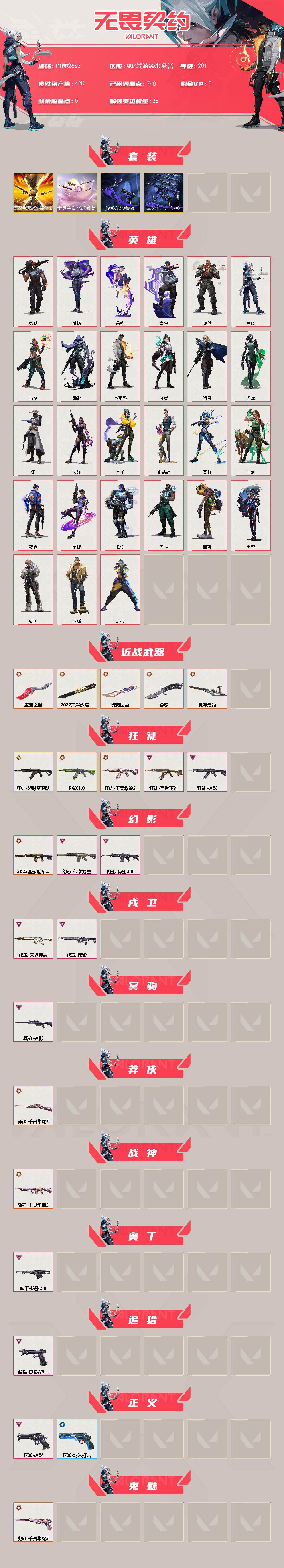 【套装】:2022全球冠军赛套装,千灵华绽//2.0套装,掠影//3.0套装,回火礼包:掠影套装 【英雄】:幻棱,炼狱,维斯,暮蝶,钛狐,壹决,铁臂,捷风,雷兹,幽影,不死鸟,贤者,猎枭,蝰蛇,零,芮娜,奇乐,尚勃勒,霓虹,斯凯,夜露,星礈,k/o,海神,盖可,黑梦,钢锁 【近战武器】:近战武器-2022全球冠军赛 蝴蝶刀,近战武器-脉冲焰矩,近战武器-影蝶,近战武器-流风回雪,近战武器-盖亚