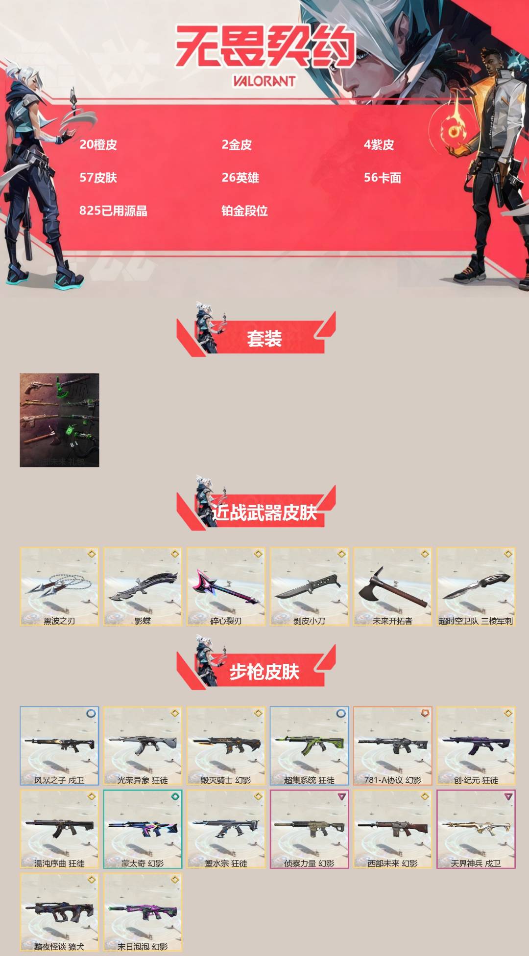 [16500003]20橙皮 2金皮 4紫皮 57皮肤 26英雄 56卡面 825已用源晶 铂金段位 【套装】西部未来 【近战武器皮肤】影蝶-掠影//3.0超时空卫队 三棱军刺未来开拓者碎心裂刃黑波之刃剥皮小刀 【佩呛皮肤】正义-西部未来标配-海洋之星2.0鬼魅-超时空卫队超集系统
