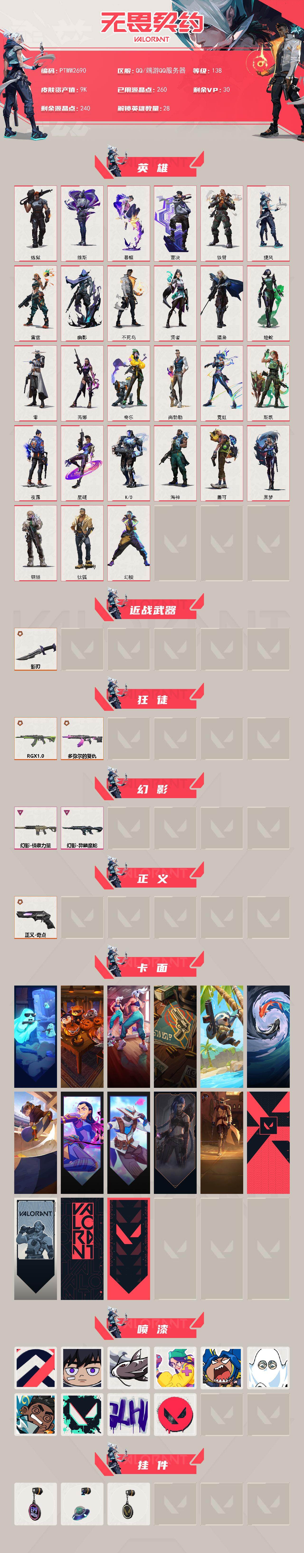 【英雄】:幻棱,炼狱,维斯,暮蝶,钛狐,壹决,铁臂,捷风,雷兹,幽影,不死鸟,贤者,猎枭,蝰蛇,零,芮娜,奇乐,尚勃勒,霓虹,斯凯,夜露,星礈,k/o,海神,盖可,黑梦,钢锁 【近战武器】:近战武器-影刃 【狂徒】:狂徒-rgx 11z pro,狂徒-多弥尔的复仇 【幻影】:幻影-侦察力量,幻影-异鳞魔蛇 【正义】:正义-奇点 【卡面】:精灵大战 卡面,南瓜盛典 卡面,热舞环节 卡面,正义的化