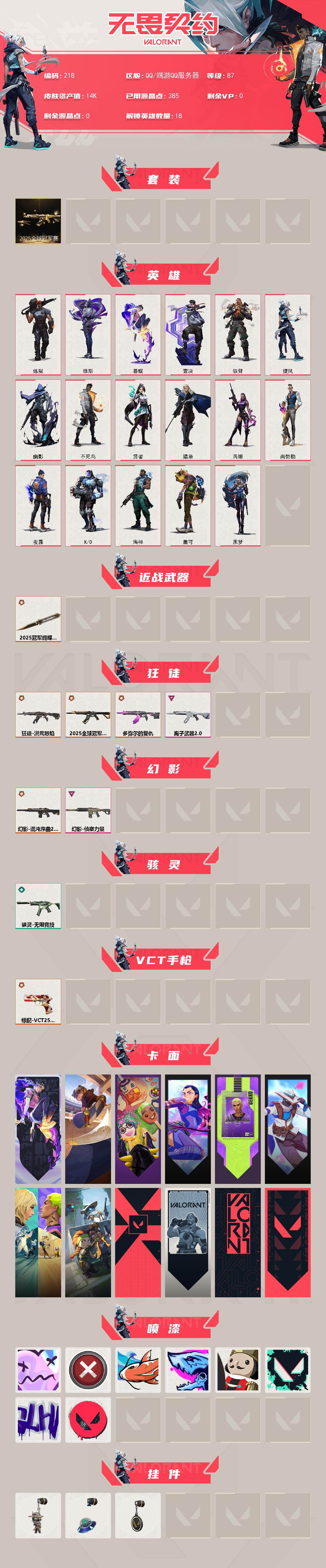 【218】【套装】:2025全球冠军赛套装 【英雄】:炼狱,维斯,暮蝶,壹决,铁臂,捷风,幽影,不死鸟,贤者,猎枭,芮娜,尚勃勒,夜露,k/o,海神,盖可,黑梦 【近战武器】:近战武器-2025全球冠军赛 蝴蝶刀 【狂徒】:狂徒-2025全球冠军赛,狂徒-洪荒怒焰,狂徒-多弥尔的复仇,狂徒-离子武器//2.0 【幻影】:幻影-混沌序曲//2.0,幻影-侦察力量 【骇灵】:骇灵-无限竞技 【vct手呛】:标配-vct25 x ag 【卡面】:无畏契约:暮蝶 卡面,clutch 卡面,瓦娃脸雪糕 卡面 ,无畏契约go!第一卷:芮娜 卡面,盖可工牌 卡面,无畏契约go!第一卷:零 卡面,钢锁vs盖可 卡面,别冒尖 卡面,代号红色 卡面,新兵报到 卡面,v契约 卡面,无畏契约 卡面 【喷漆】:伤心心 喷漆,买装还是存钱 喷漆,红鳞 喷漆,暴走萝莉 喷漆,胡桃狂想 喷漆,胜利属于无畏契约 喷漆,glhf 喷漆,无畏契约 喷漆 【挂饰】:无畏契约go!第一卷 零 挂饰,天外飞客 挂饰,无畏契约 纪念币 挂饰