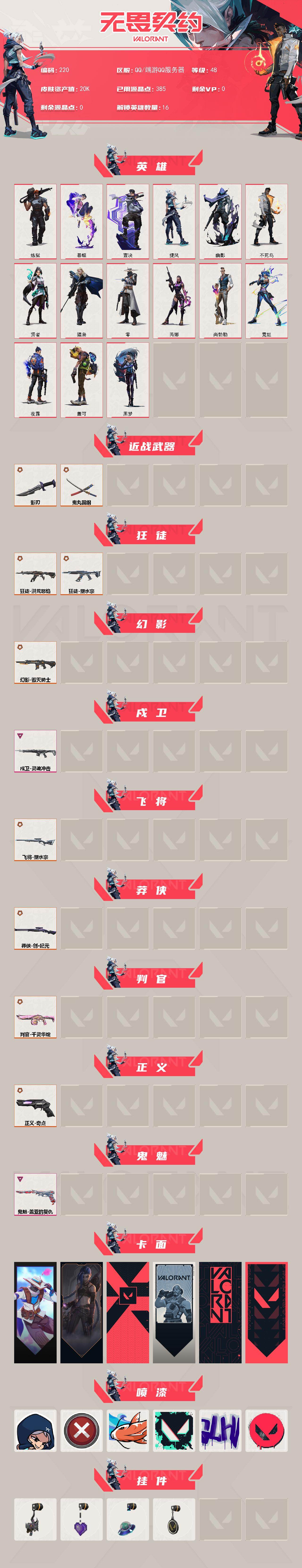 【220】【英雄】:炼狱,暮蝶,壹决,捷风,幽影,不死鸟,贤者,猎枭,零,芮娜,尚勃勒,霓虹,夜露,盖可,黑梦 【近战武器】:近战武器-鬼丸国纲,近战武器-影刃 【狂徒】:狂徒-洪荒怒焰,狂徒-塑水宗 【幻影】:幻影-毁灭骑士 【戍卫】:戍卫-灵魂冲击 【飞将】:飞将-塑水宗 【莽侠】:莽侠-创·纪元 【判官】:判官-千灵华绽 【正义】:正义-奇点 【鬼魅】:鬼魅-盖亚的复仇 【卡面】:无畏契约go!第一卷:零 卡面,《双城之战》金克丝 卡面,代号红色 卡面,新兵报到 卡面,v契约 卡面,无畏契约 卡面 【喷漆】:捷风差距 喷漆,买装还是存钱 喷漆,红鳞 喷漆,胜利属于无畏契约 喷漆,glhf 喷漆,无畏契约 喷漆 【挂饰】:鱼骨头 挂饰,薰衣草之心 挂饰,天外飞客 挂饰,无畏契约 纪念币 挂饰