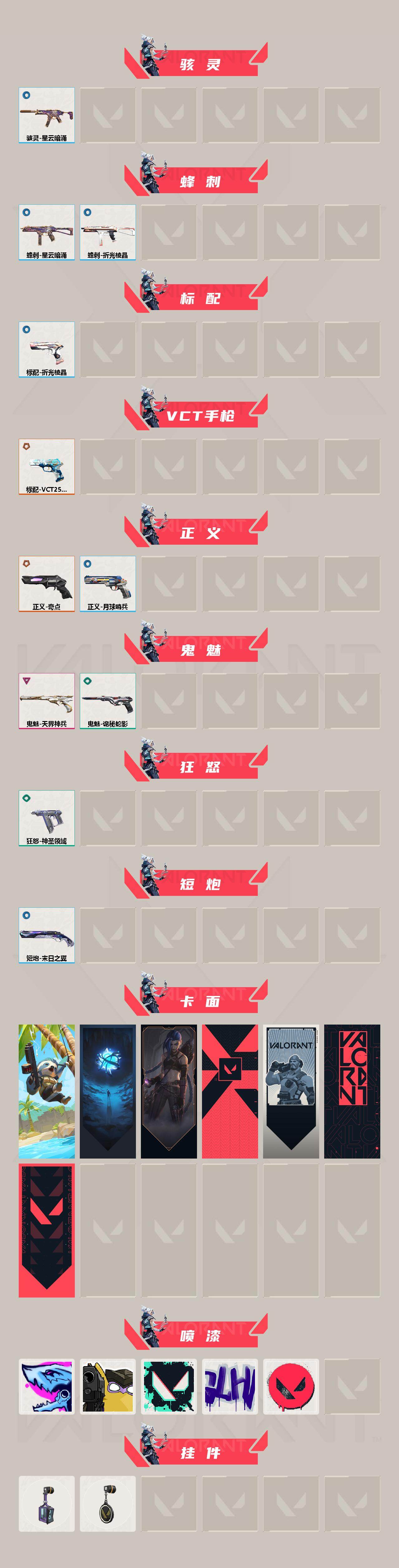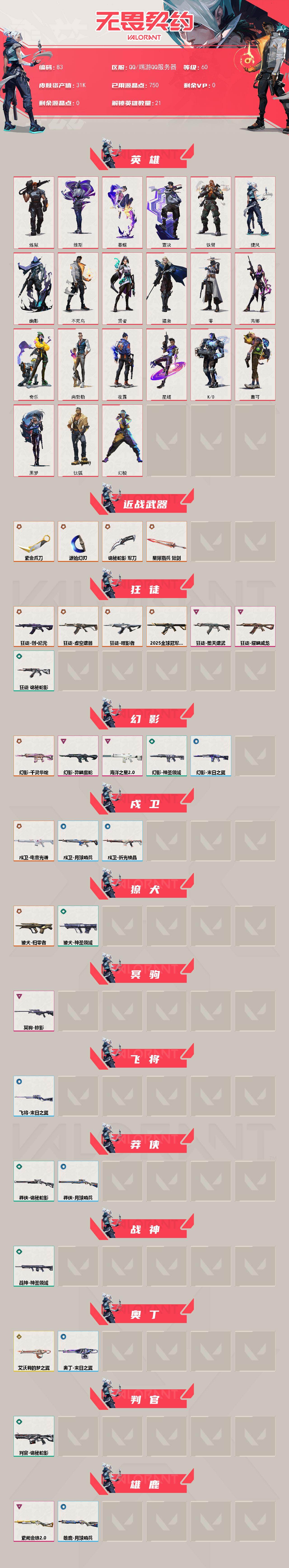 【83】【英雄】:幻棱,炼狱,维斯,暮蝶,钛狐,壹决,铁臂,捷风,幽影,不死鸟,贤者,猎枭,零,芮娜,奇乐,尚勃勒,夜露,星礈,k/o,盖可,黑梦 【近战武器】:近战武器-紫金爪刀,近战武器-源始幻刃,近战武器-诡秘蛇影 军刀,近战武器-星际猎兵 短剑 【狂徒】:狂徒-2025全球冠军赛,狂徒-创·纪元,狂徒-虚空遗器,狂徒-噬影者,狂徒-堕天遗武,狂徒-耀鳞威龙,狂徒-诡秘蛇影 【幻影】:幻影-千灵华绽,幻影-异鳞魔蛇,幻影-海洋之星//2.0,幻影-神圣领域,幻影-末日之翼 【戍卫】:戍卫-电音光谱,戍卫-月球哨兵,戍卫-折光棱晶,戍卫-电音光谱 【獠犬】:獠犬-归零者,獠犬-神圣领域 【冥驹】:冥驹-掠影 【飞将】:飞将-末日之翼 【莽侠】:莽侠-诡秘蛇影,莽侠-月球哨兵 【战神】:战神-神圣领域 【奥丁】:奥丁-艾沃莉的梦之翼,奥丁-末日之翼 【判官】:判官-诡秘蛇影 【雄鹿】:雄鹿-紫阙金琅//2.0,雄鹿-月球哨兵 【骇灵】:骇灵-星云暗涌 【蜂刺】:蜂刺-星云暗涌,蜂刺-折光棱晶 【标配】:标配-折光棱晶 【vct手呛】:标配-vct25 x lev 【正义】:正义-奇点,正义-月球哨兵 【鬼魅】:鬼魅-天界神兵,鬼魅-诡秘蛇影 【狂怒】:狂怒-神圣领域 【短炮】:短炮-末日之翼 【卡面】:树懒大作战 卡面,无垠星环 卡面,《双城之战》金克丝 卡面,代号红色 卡面,新兵报到 卡面,v契约 卡面,无畏契约 卡面 【喷漆】:暴走萝莉 喷漆,放下武器 喷漆,胜利属于无畏契约 喷漆,glhf 喷漆,无畏契约 喷漆 【挂饰】:动力机箱 挂饰,无畏契约 纪念币 挂饰