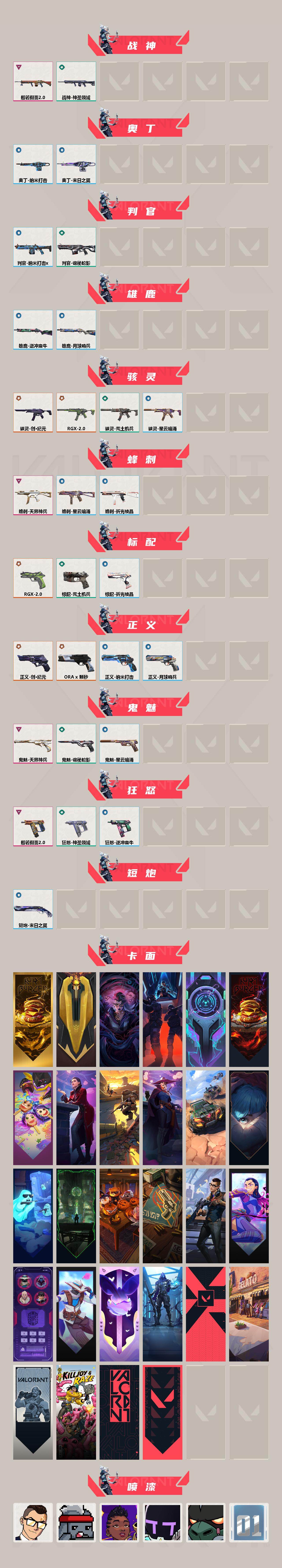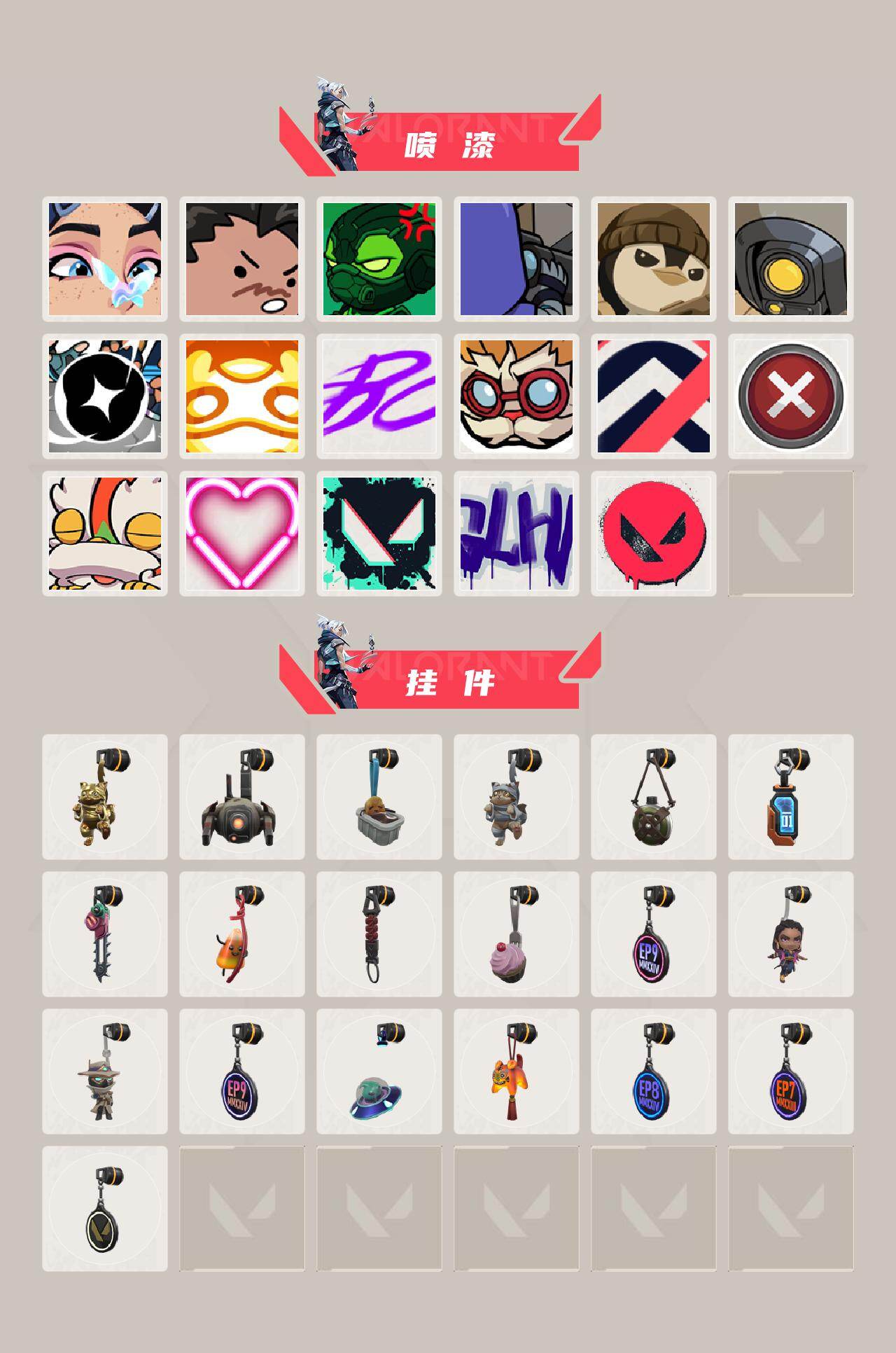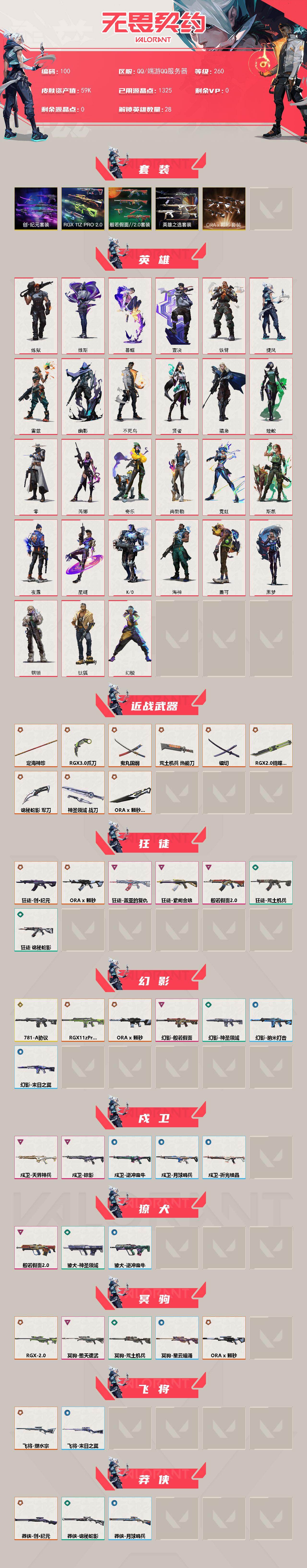 【100】【套装】:a x 颗秒套装,rgx 11z pro//2.0套装,创·纪元套装,般若假面//2.0套装,英雄之选套装 【英雄】:幻棱,炼狱,维斯,暮蝶,钛狐,壹决,铁臂,捷风,雷兹,幽影,不死鸟,贤者,猎枭,蝰蛇,零,芮娜,奇乐,尚勃勒,霓虹,斯凯,夜露,星礈,k/o,海神,盖可,黑梦,钢锁 【近战武器】:近战武器-a x 颗秒 军刀,近战武器-rgx 11z pro//2.0 蝴蝶刀,近战武器-rgx 11z pro//3.0 爪刀,近战武器-镭切,近战武器-鬼丸国纲,近战武器-定海神珍,近战武器-荒土机兵 热能刀,近战武器-诡秘蛇影 军刀,近战武器-神圣领域 战刀 【狂徒】:狂徒-创·纪元,狂徒-a x 颗秒,狂徒-般若假面//2.0,狂徒-盖亚的复仇,狂徒-紫阙金琅,狂徒-荒土机兵,狂徒-诡秘蛇影 【幻影】:幻影-781-a协议,幻影-rgx 11z pro//2.0,幻影-a x 颗秒,幻影-般若假面,幻影-神圣领域,幻影-纳米打击,幻影-末日之翼 【戍卫】:戍卫-掠影,戍卫-天界神兵,戍卫-逆冲蛮牛,戍卫-月球哨兵,戍卫-折光棱晶 【獠犬】:獠犬-般若假面//2.0,獠犬-神圣领域,獠犬-逆冲蛮牛 【冥驹】:冥驹-rgx 11z pro//2.0,冥驹-a x 颗秒,冥驹-堕天遗武,冥驹-荒土机兵,冥驹-星云暗涌 【飞将】:飞将-塑水宗,飞将-末日之翼 【莽侠】:莽侠-创·纪元,莽侠-诡秘蛇影,莽侠-月球哨兵 【战神】:战神-般若假面//2.0,战神-神圣领域 【奥丁】:奥丁-纳米打击,奥丁-末日之翼 【判官】:判官-诡秘蛇影,判官-纳米打击x 【雄鹿】:雄鹿-逆冲蛮牛,雄鹿-月球哨兵 【骇灵】:骇灵-创·纪元,骇灵-rgx 11z pro//2.0,骇灵-荒土机兵,骇灵-星云暗涌 【蜂刺】:蜂刺-天界神兵,蜂刺-星云暗涌,蜂刺-折光棱晶 【标配】:标配-rgx 11z pro//2.0,标配-荒土机兵,标配-折光棱晶 【正义】:正义-创·纪元,正义-a x 颗秒,正义-纳米打击,正义-月球哨兵 【鬼魅】:鬼魅-天界神兵,鬼魅-诡秘蛇影,鬼魅-星云暗涌 【狂怒】:狂怒-般若假面//2.0,狂怒-神圣领域,狂怒-逆冲蛮牛 【短炮】:短炮-末日之翼 【卡面】:终章:激斗汉堡 卡面,进入射程 卡面,分崩离析 卡面,纳米打击 卡面,抑制技术 卡面,激斗汉堡 卡面,瓦娃脸雪糕 p2 卡面,从黄昏到黎明 卡面,荒土机兵 卡面,银弹猎手 卡面,逆冲蛮牛 卡面,《双城之战》拥抱 卡面,精灵大战 卡面,欢迎来到底城 卡面,南瓜盛典 卡面,正义的化身 卡面,西装暴徒 卡面,无畏契约go!第一卷:芮娜 卡面,清除名单 卡面,无畏契约go!第一卷:零 卡面,化茧成蝶 卡面,暗呛 卡面,代号红色 卡面,冰淇淋店 卡面,新兵报到 卡面,友军火力 卡面,v契约 卡面,无畏契约 卡面 【喷漆】:小小心意 喷漆,战“素”兔 喷漆,宇宙的指引 喷漆,请求重启 喷漆,逆冲蛮牛 喷漆,纳米打击 喷漆,鼻尖上的蝴蝶 喷漆,简笔画黯兽 喷漆,独守蝰腹 喷漆,他们将落荒而逃 喷漆,通缉:战术企鹅 喷漆,荒土机兵 喷漆,别挡我吃球! 喷漆,嗨宝南瓜灯 喷漆,嘭! 喷漆,都算到了 喷漆,控场勿近 喷漆,买装还是存钱 喷漆,醒狮贺春 喷漆,蕊形灯 喷漆,胜利属于无畏契约 喷漆,glhf 喷漆,无畏契约 喷漆 【挂饰】:终章:猫猫木乃伊 挂饰,荒土机兵 挂饰,悠闲鸡块 挂饰,猫猫木乃伊 挂饰,水壶 挂饰,纳米打击 挂饰,逆冲蛮牛 挂饰,可爱糖糖 挂饰,伞绳 挂饰,《双城之战》小蛋糕 挂饰,第九季//第三幕 纪念币 挂饰,无畏契约go!第一卷 芮娜 挂饰,无畏契约go!第一卷 零 挂饰,第九季//第二幕 纪念币 挂饰,天外飞客 挂饰,好运福爪 挂饰,第八季//第一幕 纪念币 挂饰,第七季//第二幕 纪念币 挂饰,无畏契约 纪念币 挂饰