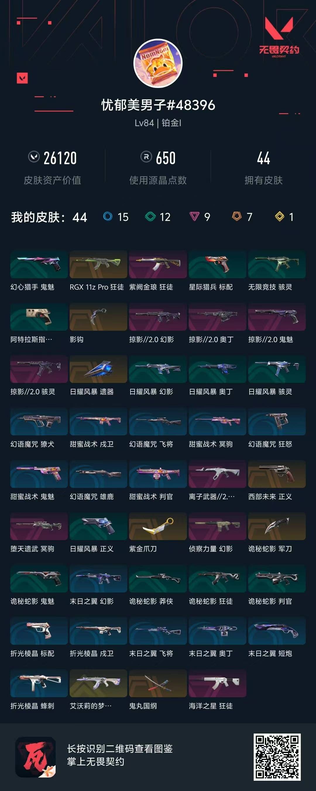 [16507900]7橙皮 1金皮 9紫皮 44皮肤 26英雄 57卡面 650已用源晶 铂金段位 【套装】掠影2.0套装 【近战武器皮肤】诡秘蛇影鬼丸国纲影钩紫金爪刀 【佩呛皮肤】正义-西部未来鬼魅-掠影2.0 【冲锋呛皮肤】骇灵-掠影2.0 【步呛皮肤】狂徒-rgx 11z p
