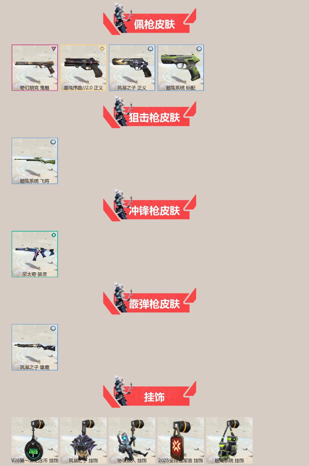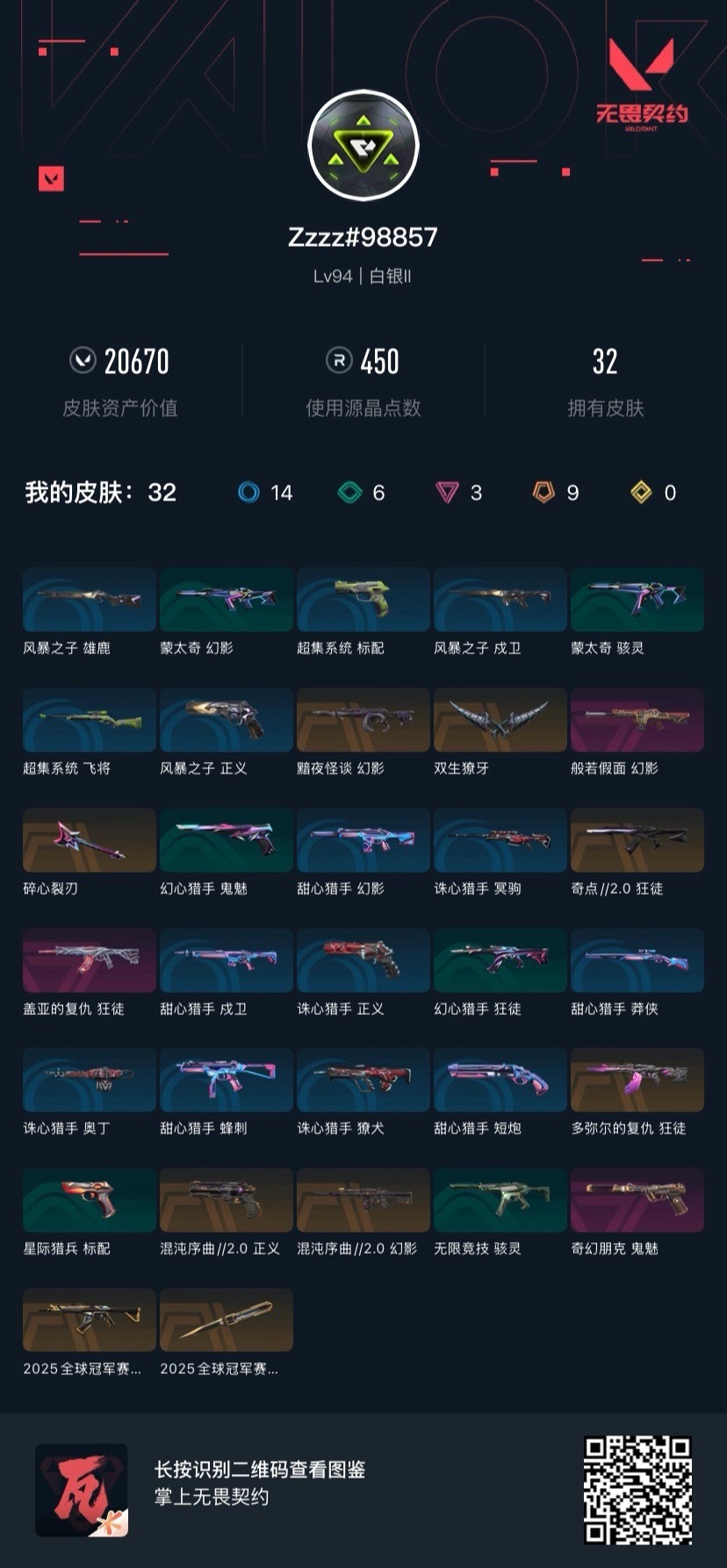 [16615154]9橙皮 3紫皮 32皮肤 16英雄 54卡面 450已用源晶 白银段位 【套装】2025全球冠军赛 【近战武器皮肤】双生獠牙2025全球冠军赛 蝴蝶刀碎心裂刃 【佩呛皮肤】正义-混沌序曲2.0超集系统 标配风暴之子 正义鬼魅-奇幻朋克 【冲锋呛皮肤】蒙太奇 骇灵 【霰弹呛皮肤】风暴之子 雄鹿 【步呛皮肤】风暴之子 戍卫狂徒-奇点//2.0幻影-混沌序曲2.0蒙太奇 幻影多弥尔的复仇 狂徒2025全球冠军赛 狂徒幻影-黯夜怪谈狂徒-盖亚的复仇幻影-般若假面 【狙击呛皮肤】超集系统 飞将 【挂饰】2025全球冠军赛挂饰风暴之子 挂饰v26第一幕纪念币 挂饰协议假人 挂饰超集系统 挂饰