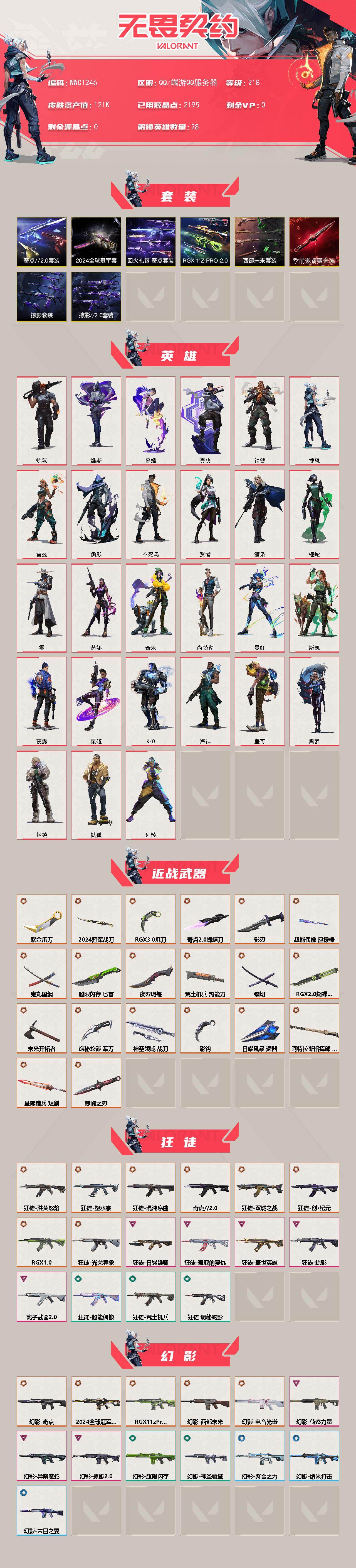 【wwc1246】终极56/传奇1/卓越19/皮肤183/等级218/段位:钻石/2024全球冠军赛套装/无畏契约季前邀请赛套装/西部未来套装/rgx 11z pro//2.0套装/奇点//2.0套装/回火礼包:奇点套装/掠影套装/掠影//2.0套装/幻棱/炼狱/维斯/暮蝶/钛狐/壹决/铁臂/捷风/雷兹/幽影/不死鸟/贤者/猎枭/蝰蛇/零/芮娜/奇乐/尚勃勒/霓虹/斯凯/夜露/星礈/k/o/海神/盖可/黑梦/钢锁/近战武器-2024全球冠军赛 战刀/近战武器-无畏契约季前邀请赛 悲悯之刃/近战武器-影钩/近战武器-rgx 11z pro//2.0 蝴蝶刀/近战武器-奇点//2.0 蝴蝶刀/近战武器-紫金爪刀/近战武器-rgx 11z pro//3.0 爪刀/近战武器-镭切/近战武器-鬼丸国纲/近战武器-未来开拓者/近战武器-超能偶像 应援棒/近战武器-超限闪存 匕首/近战武器-荒土机兵 热能刀/近战武器-夜刃诡镰/近战武器-影刃/近战武器-诡秘蛇影 军刀/近战武器-神圣领域 战刀/近战武器-日耀风暴 遗器/近战武器-阿特拉斯指挥部 甩棍/近战武器-星际猎兵 短剑/狂徒-洪荒怒焰/狂徒-混沌序曲/狂徒-奇点//2.0/狂徒-双城之战/狂徒-塑水宗/狂徒-创·纪元/狂徒-rgx 11z pro/狂徒-光荣异象/狂徒-掠影/狂徒-盖世英雄/狂徒-盖亚的复仇/狂徒-日冕雄师/狂徒-离子武器//2.0/狂徒-超能偶像/狂徒-荒土机兵/狂徒-诡秘蛇影/幻影-2024全球冠军赛/幻影-奇点/幻影-rgx 11z pro//2.0/幻影-西部未来/幻影-电音光谱/幻影-侦察力量/幻影-异鳞魔蛇/幻影-掠影//2.0/幻影-超限闪存/幻影-神圣领域/幻影-聚合之力/幻影-纳米打击/幻影-末日之翼/戍卫-掠影/戍卫-超能偶像/戍卫-浮光跃金/戍卫-逆冲蛮牛/戍卫-月球哨兵/戍卫-折光棱晶/獠犬-黯夜怪谈/獠犬-神圣领域/獠犬-采蜜小蜂队/獠犬-模拟赫兹/獠犬-逆冲蛮牛/冥驹-偃月苍龙/冥驹-rgx 11z pro//2.0/冥驹-堕天遗武/冥驹-掠影/冥驹-离子武器/冥驹-荒土机兵/冥驹-模拟赫兹/冥驹-星云暗涌/飞将-西部未来/飞将-聚合之力/飞将-末日之翼/莽侠-rgx 11z pro//3.0/莽侠-超限闪存/莽侠-诡秘蛇影/莽侠-月球哨兵/战神-奇点/战神-神圣领域/战神-采蜜小蜂队/战神-浮光跃金/奥丁-西部未来/奥丁-掠影//2.0/奥丁-纳米打击/奥丁-末日之翼/判官-千灵华绽/判官-超能偶像/判官-诡秘蛇影/判官-采蜜小蜂队/判官-纳米打击x/雄鹿-离子武器/雄鹿-模拟赫兹/雄鹿-逆冲蛮牛/雄鹿-月球哨兵/骇灵-光明哨兵//2.0/骇灵-奇点/骇灵-rgx 11z pro//2.0/骇灵-掠影//2.0/骇灵-荒土机兵/骇灵-无限竞技/骇灵-浮光跃金/骇灵-星云暗涌/蜂刺-混沌序曲/蜂刺-超限闪存/蜂刺-聚合之力/蜂刺-星云暗涌/蜂刺-折光棱晶/标配-rgx 11z pro//2.0/标配-电音光谱/标配-紫阙金琅/标配-超能偶像/标配-荒土机兵/标配-浮光跃金/标配-折光棱晶/标配-vct x lev/正义-奇点/正义-千灵华绽/正义-创·纪元/正义-西部未来/正义-掠影/正义-超限闪存/正义-纳米打击/正义-月球哨兵/鬼魅-超时空卫队/鬼魅-破败军械/鬼魅-奇点//2.0/鬼魅-天界神兵/鬼魅-掠影//2.0/鬼魅-诡秘蛇影/鬼魅-采蜜小蜂队/鬼魅-模拟赫兹/鬼魅-星云暗涌/狂怒-全息波普/狂怒-神圣领域/狂怒-聚合之力/狂怒-逆冲蛮牛/短炮-末日之翼/终章:激斗汉堡 卡面/进入射程 卡面/分崩离析 卡面/纳米打击 卡面/抑制技术 卡面/激斗汉堡 卡面/瓦娃脸雪糕 p2 卡面/从黄昏到黎明 卡面/荒土机兵 卡面/银弹猎手 卡面/逆冲蛮牛 卡面/《双城之战》拥抱 卡面/精灵大战 卡面/欢迎来到底城 卡面/南瓜盛典 卡面/vct cn首冠 卡面/唱片的故事 卡面/钢弓与箭弦 卡面/排除故障 卡面/奇点//2.0 卡面/战术桌游 卡面/悠享食光 卡面/修车达人 卡面/热舞环节 卡面/模拟赫兹 卡面/浮光跃金 卡面/超限闪存 卡面/维斯工牌 卡面/正义的化身 卡面/终章:生意人麦宝 卡面/铁之华 卡面/2024全球冠军赛 卡面/失而复得 卡面/时间到 卡面/最高舞台 卡面/复活专家 卡面/归乡 // 蝰蛇 卡面/超能偶像 卡面/生意人麦宝 卡面/声感陷阱设计图 卡面/红鳞松叶 卡面/clutch 卡面/钢锁工牌 卡面/战术小伙伴的夏日 卡面/采蜜小蜂队 卡面/聚合之力 卡面/梦幻奶茶 卡面/无畏契约go!第一卷:芮娜 卡面/深海水族 卡面/盖可工牌 卡面/无畏契约go!第一卷:零 卡面/《双城之战》金克丝 卡面/战术小伙伴 卡面/无畏契约go!第一卷:贤者 卡面/钢锁vs盖可 卡面/代号红色 卡面/新兵报到 卡面/v契约 卡面/无畏契约 卡面/小小心意 喷漆/战“素”兔 喷漆/宇宙的指引 喷漆/请求重启 喷漆/逆冲蛮牛 喷漆/纳米打击 喷漆/鼻尖上的蝴蝶 喷漆/简笔画黯兽 喷漆/独守蝰腹 喷漆/他们将落荒而逃 喷漆/通缉:战术企鹅 喷漆/荒土机兵 喷漆/别挡我吃球! 喷漆/嗨宝南瓜灯 喷漆/嘭! 喷漆/都算到了 喷漆/控场勿近 喷漆/皮蛋呼呼 喷漆/像素星礈 喷漆/图谋不轨的零 喷漆/小丑猫 喷漆/模拟赫兹 喷漆/高丽风情小熊 喷漆/奇点//2.0 喷漆/蹲到一个 喷漆/全力集中 喷漆/超限闪存 喷漆/rua一下 喷漆/熊抱 喷漆/蛋糕还是爆能器? 喷漆/高丽风情小虎 喷漆/记在小本本 喷漆/防弹企鹅 喷漆/高丽风情小蛙 喷漆/2024全球冠军赛 喷漆/又被闪了 喷漆/终极羞辱 喷漆/超级粉丝 喷漆/黯兽卖萌 喷漆/捷风差距 喷漆/惊声尖叫 喷漆/五人成星 喷漆/超能偶像 喷漆/放我出去 喷漆/掩护我 喷漆/大佬发呛 喷漆/边缘试探 喷漆/拼一呛 喷漆/聚合之力 喷漆/采蜜小蜂队 喷漆/梦幻小队 喷漆/五个全都齐了 喷漆/买装还是存钱 喷漆/萌化了 喷漆/无畏契约go!第一卷:芮娜 喷漆/无畏契约go!第一卷:奇乐 喷漆/战术小伙伴 喷漆/这是你掉的吗? 喷漆/这招不