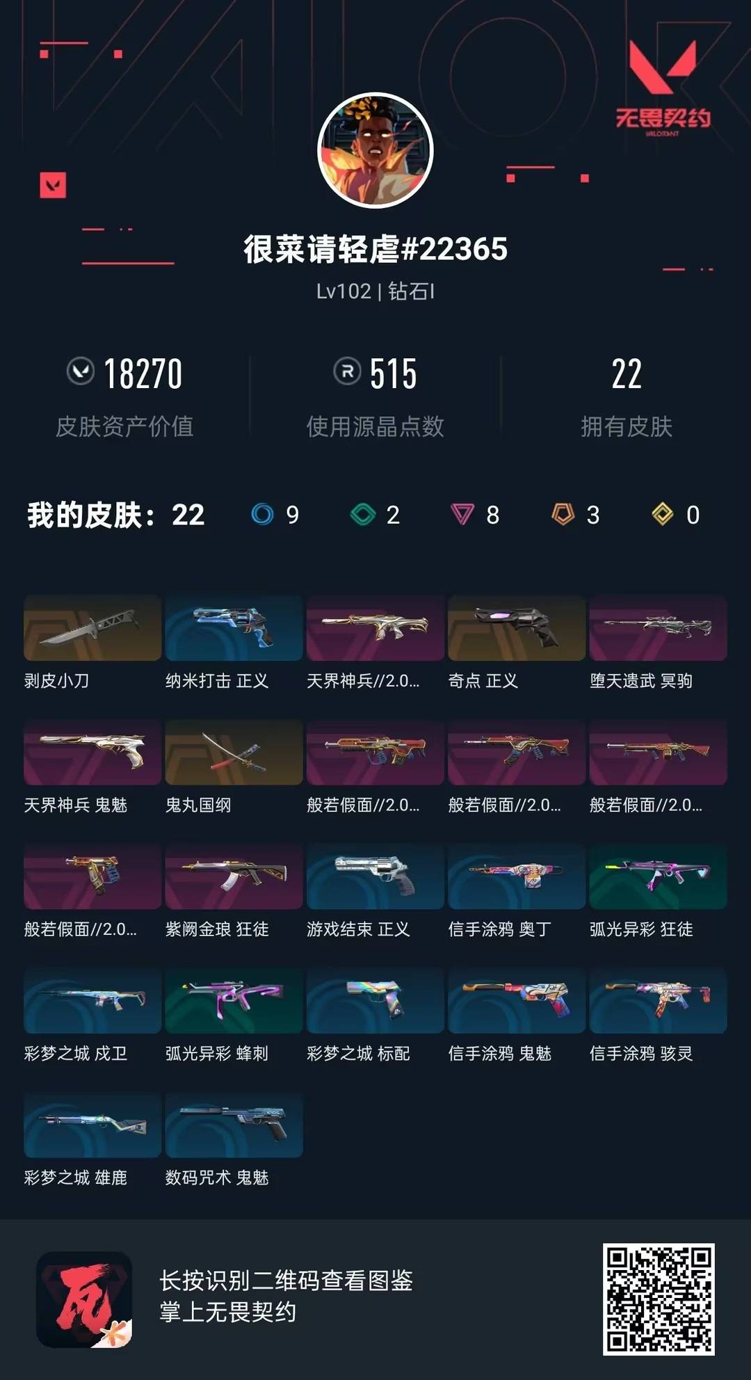 3橙皮 8紫皮 22皮肤 19英雄 60卡面 515已用源晶 钻石段位 【套装】:般若假面//2.0套装 【近战武器皮肤】:鬼丸国纲剥皮小刀 【佩呛皮肤】:狂怒-般若假面//2.0正义-奇点鬼魅-天界神兵 【步呛皮肤】:獠犬-般若假面//2.0狂徒-般若假面//2.0狂徒-紫阙金琅幻影