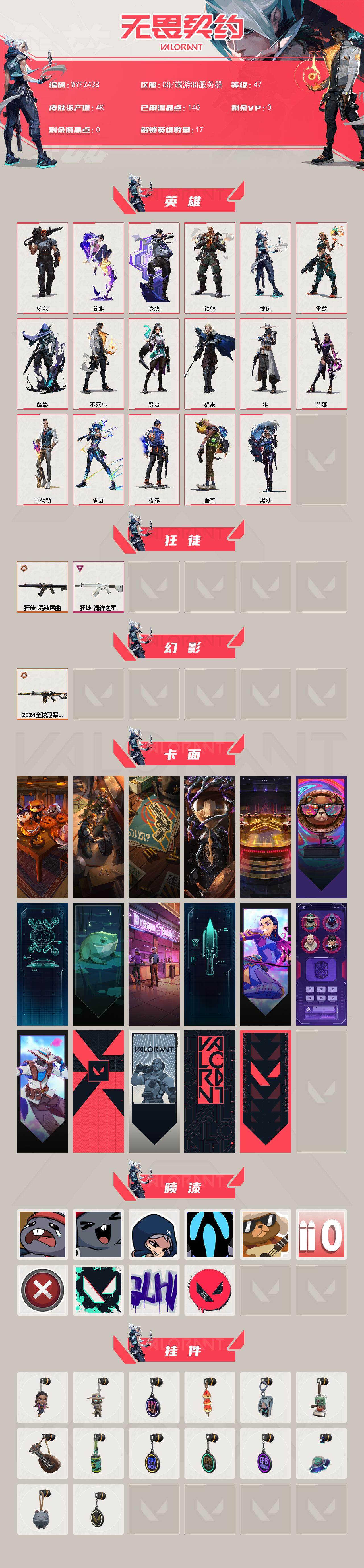 【wyf2438】终极2/卓越1/皮肤4/等级47/段位:青铜/炼狱/暮蝶/壹决/铁臂/捷风/雷兹/幽影/不死鸟/贤者/猎枭/零/芮娜/尚勃勒/霓虹/夜露/盖可/黑梦/混沌序曲-狂徒/海洋之星-狂徒/2024全球冠军赛-幻影/南瓜盛典 卡面/修车达人 卡面/正义的化身 卡面/时间到 卡面/最高舞台 卡面/音熊登场 卡面/声感陷阱设计图 卡面/霓帧牛蛙 卡面/梦幻奶茶 卡面/零点嗅探设计