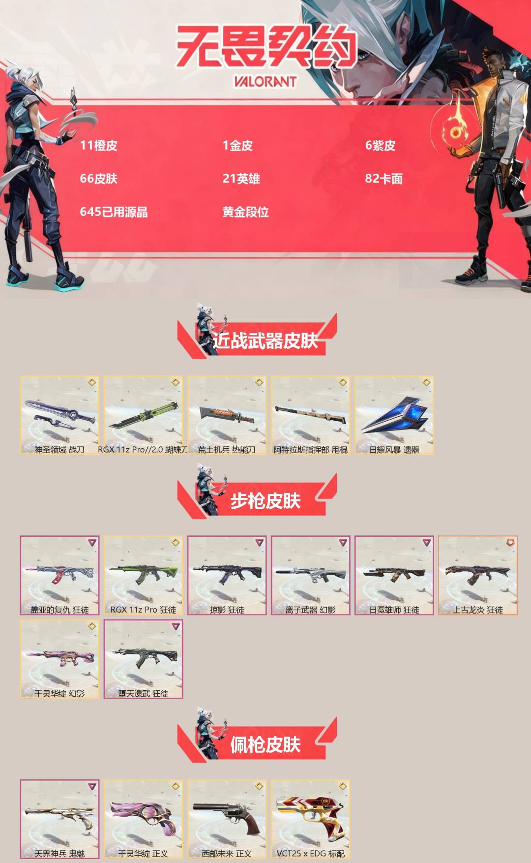[16542640]11橙皮 1金皮 6紫皮 66皮肤 21英雄 82卡面 645已用源晶 黄金段位 【近战武器皮肤】阿特拉斯指挥部荒土机兵热能刀日耀风暴 遗器rgx 11z pro//2.0 蝴蝶刀神圣领域 战刀 【佩呛皮肤】正义-西部未来标配-vct25xedg正义-千灵华绽鬼魅