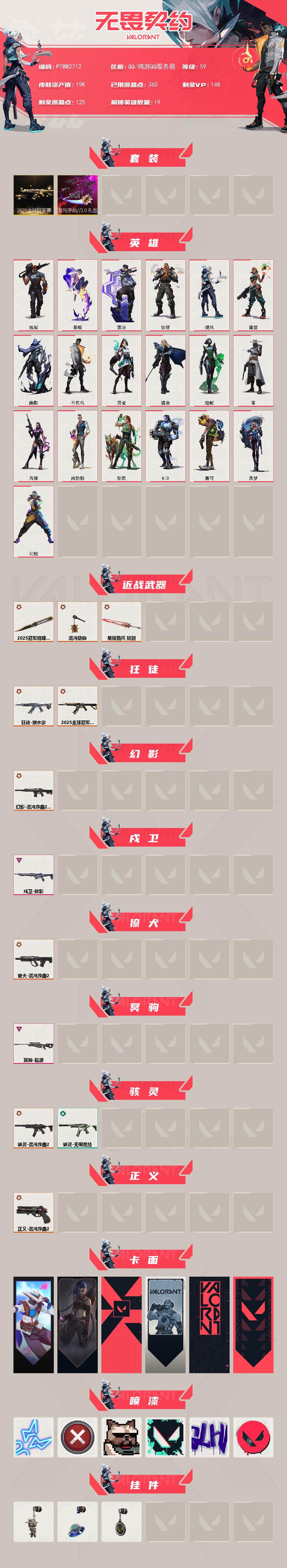 【套装】:2025全球冠军赛套装,混沌序曲//2.0套装 【英雄】:幻棱,炼狱,暮蝶,壹决,铁臂,捷风,雷兹,幽影,不死鸟,贤者,猎枭,蝰蛇,零,芮娜,尚勃勒,斯凯,k/o,盖可,黑梦 【近战武器】:近战武器-2025全球冠军赛 蝴蝶刀,近战武器-混沌链枷,近战武器-星际猎兵 短剑 【狂徒】:狂徒-2025全球冠军赛,狂徒-塑水宗 【幻影】:幻影-混沌序曲//2.0 【戍卫】:戍卫-掠影 【獠