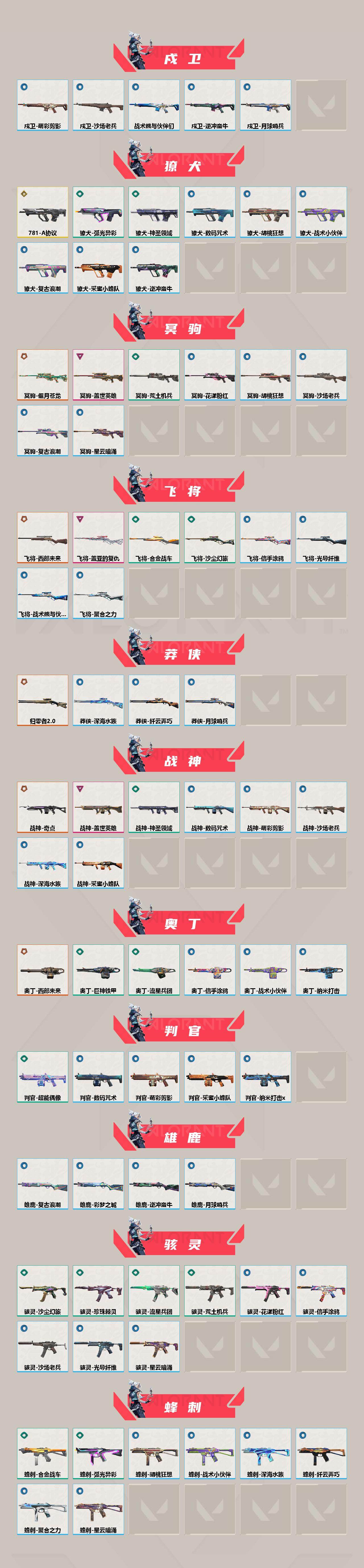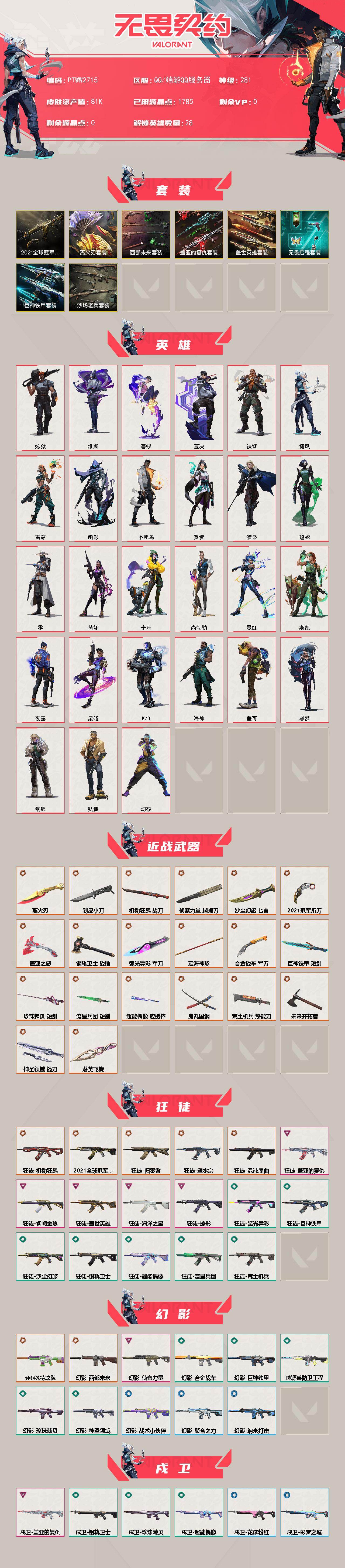 【套装】:离火刃套装,2021全球冠军赛套装,西部未来套装,离火刃套装,盖世英雄套装,盖亚的复仇套装,无畏启程套装,巨神铁甲套装,沙场老兵套装 【英雄】:幻棱,炼狱,维斯,暮蝶,钛狐,壹决,铁臂,捷风,雷兹,幽影,不死鸟,贤者,猎枭,蝰蛇,零,芮娜,奇乐,尚勃勒,霓虹,斯凯,夜露,星礈,k/o,海神,盖可,黑梦,钢锁 【近战武器】:近战武器-2021全球冠军赛 爪刀,近战武器-侦察力量 蝴蝶刀