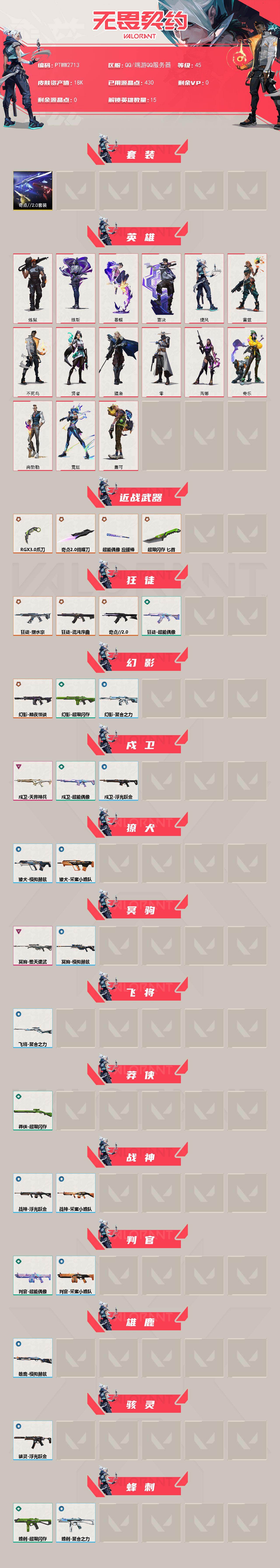 【套装】:奇点//2.0套装 【英雄】:炼狱,维斯,暮蝶,壹决,捷风,雷兹,不死鸟,贤者,猎枭,零,芮娜,奇乐,尚勃勒,霓虹,盖可 【近战武器】:近战武器-奇点//2.0 蝴蝶刀,近战武器-rgx 11z pro//3.0 爪刀,近战武器-超能偶像 应援棒,近战武器-超限闪存 匕首 【狂徒】:狂徒-混沌序曲,狂徒-奇点//2.0,狂徒-塑水宗,狂徒-超能偶像 【幻影】:幻影-黯夜怪谈,幻影-超