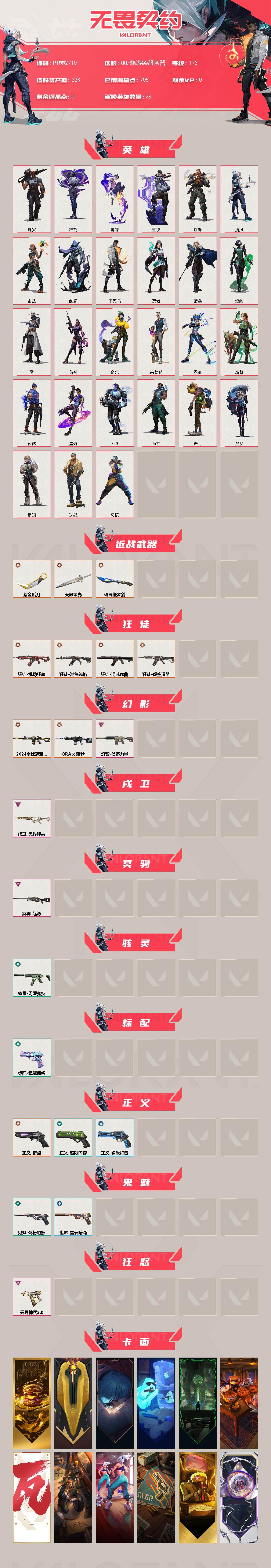【英雄】:幻棱,炼狱,维斯,暮蝶,钛狐,壹决,铁臂,捷风,雷兹,幽影,不死鸟,贤者,猎枭,蝰蛇,零,芮娜,奇乐,尚勃勒,霓虹,斯凯,夜露,星礈,k/o,海神,盖可,黑梦,钢锁 【近战武器】:近战武器-紫金爪刀,近战武器-琉璃锻梦剑,近战武器-天界荣光 【狂徒】:狂徒-洪荒怒焰,狂徒-混沌序曲,狂徒-机动狂飙,狂徒-虚空遗器 【幻影】:幻影-2024全球冠军赛,幻影-a x 颗秒,幻影-侦察