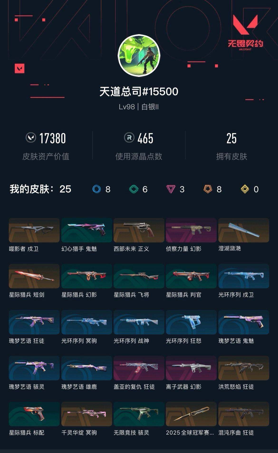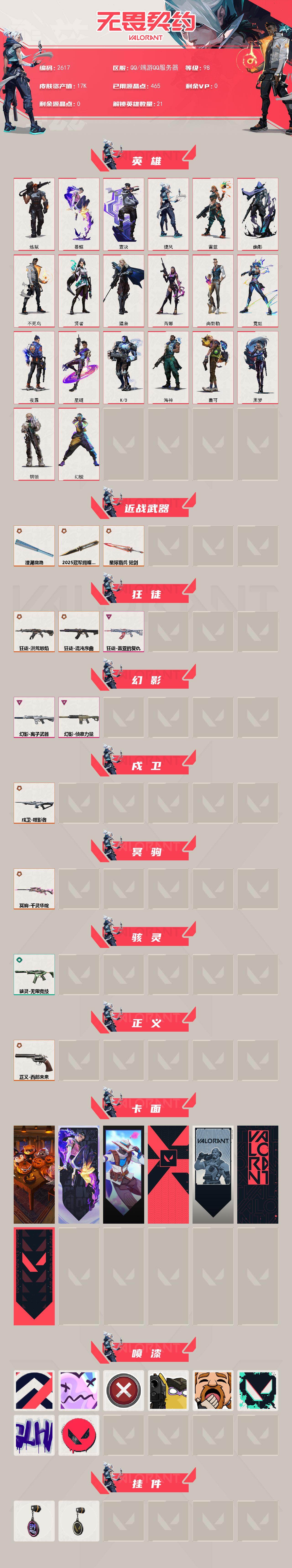 [16644417]【英雄】:幻棱,炼狱,暮蝶,壹决,捷风,雷兹,幽影,不死鸟,贤者,猎枭,芮娜,尚勃勒,霓虹,夜露,星礈,k/o,海神,盖可,黑梦,钢锁 【近战武器】:近战武器-2025全球冠军赛 蝴蝶刀,近战武器-澄湖潋滟,近战武器-星际猎兵 短剑 【狂徒】:狂徒-洪荒怒焰,狂徒-混沌序曲,狂徒-盖亚的复仇 【幻影】:幻影-离子武器,幻影-侦察力量 【戍卫】:戍卫-噬影者 【冥驹】:冥驹-千灵华绽 【骇灵】:骇灵-无限竞技 【正义】:正义-西部未来 【卡面】:南瓜盛典 卡面,无畏契约:暮蝶 卡面,无畏契约go!第一卷:零 卡面,代号红色 卡面,新兵报到 卡面,v契约 卡面,无畏契约 卡面 【喷漆】:控场勿近 喷漆,伤心心 喷漆,买装还是存钱 喷漆,放下武器 喷漆,老铁困了 喷漆,胜利属于无畏契约 喷漆,glhf 喷漆,无畏契约 喷漆 【挂饰】:第九季//第三幕 纪念币 挂饰,无畏契约 纪念币 挂饰