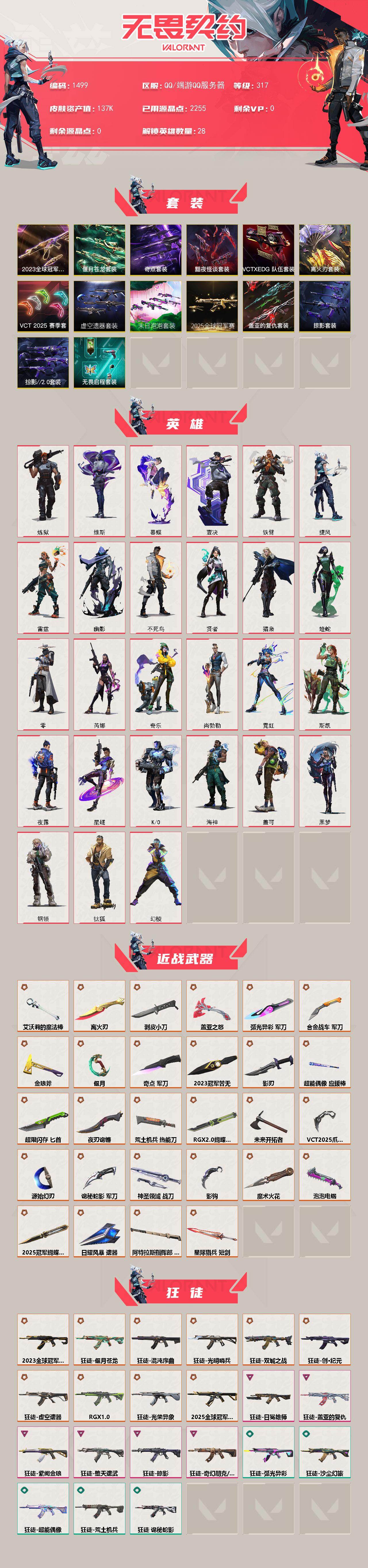 【1499】xl14494 【套装】:离火刃套装,2025全球冠军赛套装,2023全球冠军赛套装,末日泡泡套装,虚空遗器套装,vct 2025 赛季套装,离火刃套装,奇点套装,黯夜怪谈套装,偃月苍龙套装,vctxedg 队伍套装,掠影套装,盖亚的复仇套装,掠影//2.0套装,无畏启程套装 【英雄】:幻棱,炼狱,维斯,暮蝶,钛狐,壹决,铁臂,捷风,雷兹,幽影,不死鸟,贤者,猎枭,蝰蛇,零,芮娜,奇乐,尚勃勒,霓虹,斯凯,夜露,星礈,k/o,海神,盖可,黑梦,钢锁 【近战武器】:近战武器-2025全球冠军赛 蝴蝶刀,近战武器-2023全球冠军赛 苦无,近战武器-泡泡电锯,近战武器-魔术火花,近战武器-影钩,近战武器-rgx 11z pro//2.0 蝴蝶刀,近战武器-剥皮小刀,近战武器-vct 2025 爪刀,近战武器-离火刃,近战武器-奇点 军刀,近战武器-艾沃莉的魔法棒,近战武器-源始幻刃,近战武器-未来开拓者,近战武器-超能偶像 应援棒,近战武器-超限闪存 匕首,近战武器-盖亚之怒,近战武器-合金战车 军刀,近战武器-弧光异彩 军刀,近战武器-荒土机兵 热能刀,近战武器-金琅斧,近战武器-偃月,近战武器-夜刃诡镰,近战武器-影刃,近战武器-诡秘蛇影 军刀,近战武器-神圣领域 战刀,近战武器-日耀风暴 遗器,近战武器-阿特拉斯指挥部 甩棍,近战武器-星际猎兵 短剑,近战武器-魔术火花 【狂徒】:狂徒-2025全球冠军赛,狂徒-2023全球冠军赛,狂徒-光明哨兵,狂徒-混沌序曲,狂徒-双城之战,狂徒-偃月苍龙,狂徒-创·纪元,狂徒-虚空遗器,狂徒-rgx 11z pro,狂徒-光荣异象,狂徒-堕天遗武,狂徒-掠影,狂徒-盖亚的复仇,狂徒-日冕雄师,狂徒-紫阙金琅,狂徒-奇幻朋克//3.0,狂徒-超能偶像,狂徒-弧光异彩,狂徒-荒土机兵,狂徒-沙尘幻旅,狂徒-诡秘蛇影 【幻影】:幻影-黯夜怪谈,幻影-砰砰x特攻队,幻影-奇点,幻影-虚空遗器,幻影-末日泡泡,幻影-侦察力量,幻影-掠影//2.0,幻影-奇幻朋克//3.0,幻影-超限闪存,幻影-合金战车,幻影-噬源兽防卫工程,幻影-神圣领域,幻影-聚合之力,幻影-纳米打击,幻影-末日之翼 【戍卫】:戍卫-掠影,戍卫-盖亚的复仇,戍卫-超能偶像,戍卫-彩梦之城,戍卫-浮光跃金,戍卫-花漾粉红,戍卫-萌彩剪影,戍卫-逆冲蛮牛,戍卫-月球哨兵,戍卫-折光棱晶 【獠犬】:獠犬-黯夜怪谈,獠犬-归零者,獠犬-弧光异彩,獠犬-神圣领域,獠犬-采蜜小蜂队,獠犬-胡桃狂想,獠犬-模拟赫兹,獠犬-逆冲蛮牛,獠犬-数码咒术 【冥驹】:冥驹-偃月苍龙,冥驹-末日泡泡,冥驹-掠影,冥驹-荒土机兵,冥驹-胡桃狂想,冥驹-花漾粉红,冥驹-模拟赫兹,冥驹-星云暗涌 【飞将】:飞将-黯夜怪谈,飞将-盖亚的复仇,飞将-合金战车,飞将-沙尘幻旅,飞将-聚合之力,飞将-信手涂鸦,飞将-末日之翼 【莽侠】:莽侠-超限闪存,莽侠-诡秘蛇影,莽侠-月球哨兵 【战神】:战神-奇点,战神-离子武器//2.0,战神-神圣领域,战神-采蜜小蜂队,战神-浮光跃金,战神-萌彩剪影,战神-数码咒术 【奥丁】:奥丁-掠影//2.0,奥丁-纳米打击,奥丁-信手涂鸦,奥丁-末日之翼 【判官】:判官-偃月苍龙,判官-虚空遗器,判官-超能偶像,判官-诡秘蛇影,判官-采蜜小蜂队,判官-萌彩剪影,判官-纳米打击x,判官-数码咒术 【雄鹿】:雄鹿-起源,雄鹿-彩梦之城,雄鹿-模拟赫兹,雄鹿-逆冲蛮牛,雄鹿-月球哨兵 【骇灵】:骇灵-奇点,骇灵-紫阙金琅,骇灵-掠影//2.0,骇灵-荒土机兵,骇灵-沙尘幻旅,骇灵-无限竞技,骇灵-浮光跃金,骇灵-花漾粉红,骇灵-信手涂鸦,骇灵-星云暗涌 【蜂刺】:蜂刺-末日泡泡,蜂刺-超限闪存,蜂刺-合金战车,蜂刺-弧光异彩,蜂刺-胡桃狂想,蜂刺-聚合之力,蜂刺-星云暗涌,蜂刺-折光棱晶 【标配】:标配-黯夜怪谈,标配-超能偶像,标配-荒土机兵,标配-彩梦之城,标配-超能冲撞,标配-浮光跃金,标配-折光棱晶 【vct手呛】:标配-vct x edg 【正义】:正义-奇点,正义-偃月苍龙,正义-西部未来,正义-虚空遗器,正义-末日泡泡,正义-掠影,正义-奇幻朋克//2.0,正义-超限闪存,正义-合金战车,正义-纳米打击,正义-游戏结束,正义-月球哨兵 【鬼魅】:鬼魅-盖亚的复仇,鬼魅-掠影//2.0,鬼魅-诡秘蛇影,鬼魅-采蜜小蜂队,鬼魅-胡桃狂想,鬼魅-模拟赫兹,鬼魅-扑棱扑棱,鬼魅-数码咒术,鬼魅-宿怨,鬼魅-信手涂鸦,鬼魅-星云暗涌 【狂怒】:狂怒-神圣领域,狂怒-花漾粉红,狂怒-聚合之力,狂怒-萌彩剪影,狂怒-逆冲蛮牛 【短炮】:短炮-弧光异彩,短炮-天才少女,短炮-末日之翼 【卡面】:终章:激斗汉堡 卡面,进入射程 卡面,分崩离析 卡面,纳米打击 卡面,抑制技术 卡面,激斗汉堡 卡面,瓦娃脸雪糕 p2 卡面,从黄昏到黎明 卡面,荒土机兵 卡面,银弹猎手 卡面,逆冲蛮牛 卡面,《双城之战》拥抱 卡面,精灵大战 卡面,欢迎来到底城 卡面,南瓜盛典 卡面,vct cn首冠 卡面,唱片的故事 卡面,钢弓与箭弦 卡面,无畏契约:暮蝶 卡面,排除故障 卡面,战术桌游 卡面,悠享食光 卡面,修车达人 卡面,热舞环节 卡面,模拟赫兹 卡面,浮光跃金 卡面,超限闪存 卡面,维斯工牌 卡面,正义的化身 卡面,终章:生意人麦宝 卡面,铁之华 卡面,失而复得 卡面,时间到 卡面,最高舞台 卡面,复活专家 卡面,归乡 // 蝰蛇 卡面,超能偶像 卡面,生意人麦宝 卡面,树懒大作战 卡面,声感陷阱设计图 卡面,红鳞松叶 卡面,clutch 卡面,霓帧牛蛙 卡面,钢锁工牌 卡面,战术小伙伴的夏日 卡面,采蜜小蜂队 卡面,聚合之力 卡面,梦幻奶茶 卡面,源能反应 卡面,零点嗅探设计图 卡面,沙雕爆能器 卡面,无畏契约go!第一卷:芮娜 卡面,清除名单 卡面,无畏契约go!第一卷:零 卡面,龍记 卡面,无垠星环 