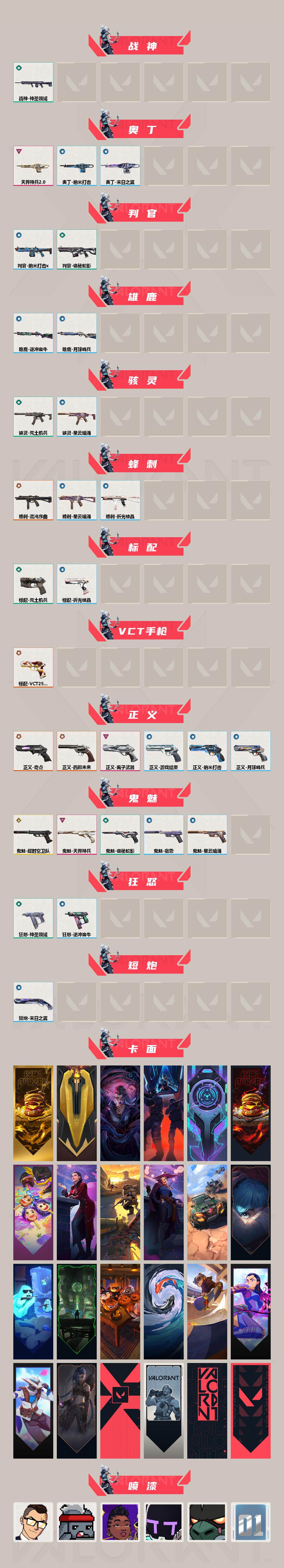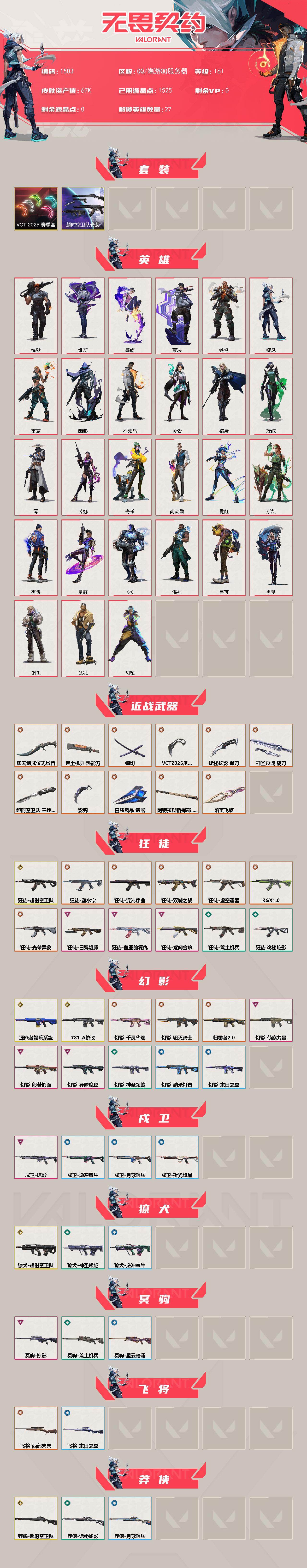 【1503】xl24447【套装】:超时空卫队套装,vct 2025 赛季套装 【英雄】:幻棱,炼狱,维斯,暮蝶,钛狐,壹决,铁臂,捷风,雷兹,幽影,不死鸟,贤者,猎枭,蝰蛇,零,芮娜,奇乐,尚勃勒,霓虹,斯凯,夜露,星礈,k/o,海神,盖可,黑梦,钢锁 【近战武器】:近战武器-影钩,近战武器-超时空卫队 三棱军刺,近战武器-vct 2025 爪刀,近战武器-落英飞旋,近战武器-镭切,近战武器-堕天遗武 仪式匕首,近战武器-荒土机兵 热能刀,近战武器-诡秘蛇影 军刀,近战武器-神圣领域 战刀,近战武器-日耀风暴 遗器,近战武器-阿特拉斯指挥部 甩棍 【狂徒】:狂徒-超时空卫队,狂徒-混沌序曲,狂徒-双城之战,狂徒-塑水宗,狂徒-虚空遗器,狂徒-rgx 11z pro,狂徒-光荣异象,狂徒-盖亚的复仇,狂徒-日冕雄师,狂徒-紫阙金琅,狂徒-荒土机兵,狂徒-诡秘蛇影 【幻影】:幻影-781-a协议,幻影-源能者娱乐系统,幻影-归零者//2.0,幻影-毁灭骑士,幻影-千灵华绽,幻影-般若假面,幻影-侦察力量,幻影-异鳞魔蛇,幻影-神圣领域,幻影-纳米打击,幻影-末日之翼 【戍卫】:戍卫-掠影,戍卫-逆冲蛮牛,戍卫-月球哨兵,戍卫-折光棱晶 【獠犬】:獠犬-超时空卫队,獠犬-神圣领域,獠犬-逆冲蛮牛 【冥驹】:冥驹-掠影,冥驹-荒土机兵,冥驹-星云暗涌 【飞将】:飞将-西部未来,飞将-末日之翼 【莽侠】:莽侠-超时空卫队,莽侠-诡秘蛇影,莽侠-月球哨兵 【战神】:战神-神圣领域 【奥丁】:奥丁-天界神兵//2.0,奥丁-纳米打击,奥丁-末日之翼 【判官】:判官-诡秘蛇影,判官-纳米打击x 【雄鹿】:雄鹿-逆冲蛮牛,雄鹿-月球哨兵 【骇灵】:骇灵-荒土机兵,骇灵-星云暗涌 【蜂刺】:蜂刺-混沌序曲,蜂刺-星云暗涌,蜂刺-折光棱晶 【标配】:标配-荒土机兵,标配-折光棱晶 【vct手呛】:标配-vct25 x edg 【正义】:正义-奇点,正义-西部未来,正义-离子武器,正义-纳米打击,正义-游戏结束,正义-月球哨兵 【鬼魅】:鬼魅-超时空卫队,鬼魅-天界神兵,鬼魅-诡秘蛇影,鬼魅-宿怨,鬼魅-星云暗涌 【狂怒】:狂怒-神圣领域,狂怒-逆冲蛮牛 【短炮】:短炮-末日之翼 【卡面】:终章:激斗汉堡 卡面,进入射程 卡面,分崩离析 卡面,纳米打击 卡面,抑制技术 卡面,激斗汉堡 卡面,瓦娃脸雪糕 p2 卡面,从黄昏到黎明 卡面,荒土机兵 卡面,银弹猎手 卡面,逆冲蛮牛 卡面,《双城之战》拥抱 卡面,精灵大战 卡面,欢迎来到底城 卡面,南瓜盛典 卡面,红鳞松叶 卡面,clutch 卡面,无畏契约go!第一卷:芮娜 卡面,无畏契约go!第一卷:零 卡面,《双城之战》金克丝 卡面,代号红色 卡面,新兵报到 卡面,v契约 卡面,无畏契约 卡面 【喷漆】:小小心意 喷漆,战“素”兔 喷漆,宇宙的指引 喷漆,请求重启 喷漆,逆冲蛮牛 喷漆,纳米打击 喷漆,鼻尖上的蝴蝶 喷漆,简笔画黯兽 喷漆,独守蝰腹 喷漆,他们将落荒而逃 喷漆,通缉:战术企鹅 喷漆,荒土机兵 喷漆,别挡我吃球! 喷漆,嗨宝南瓜灯 喷漆,嘭! 喷漆,都算到了 喷漆,控场勿近 喷漆,新潮流 喷漆,买装还是存钱 喷漆,关门放狗 喷漆,松叶 喷漆,胜利属于无畏契约 喷漆,glhf 喷漆,无畏契约 喷漆 【挂饰】:终章:猫猫木乃伊 挂饰,荒土机兵 挂饰,悠闲鸡块 挂饰,猫猫木乃伊 挂饰,水壶 挂饰,纳米打击 挂饰,逆冲蛮牛 挂饰,可爱糖糖 挂饰,伞绳 挂饰,《双城之战》小蛋糕 挂饰,第九季//第三幕 纪念币 挂饰,z世代特饮 挂饰,vct x edg 挂饰,天外飞客 挂饰,红鳞松叶 挂饰,《双城之战》魄罗 挂饰,无畏契约 纪念币 挂饰