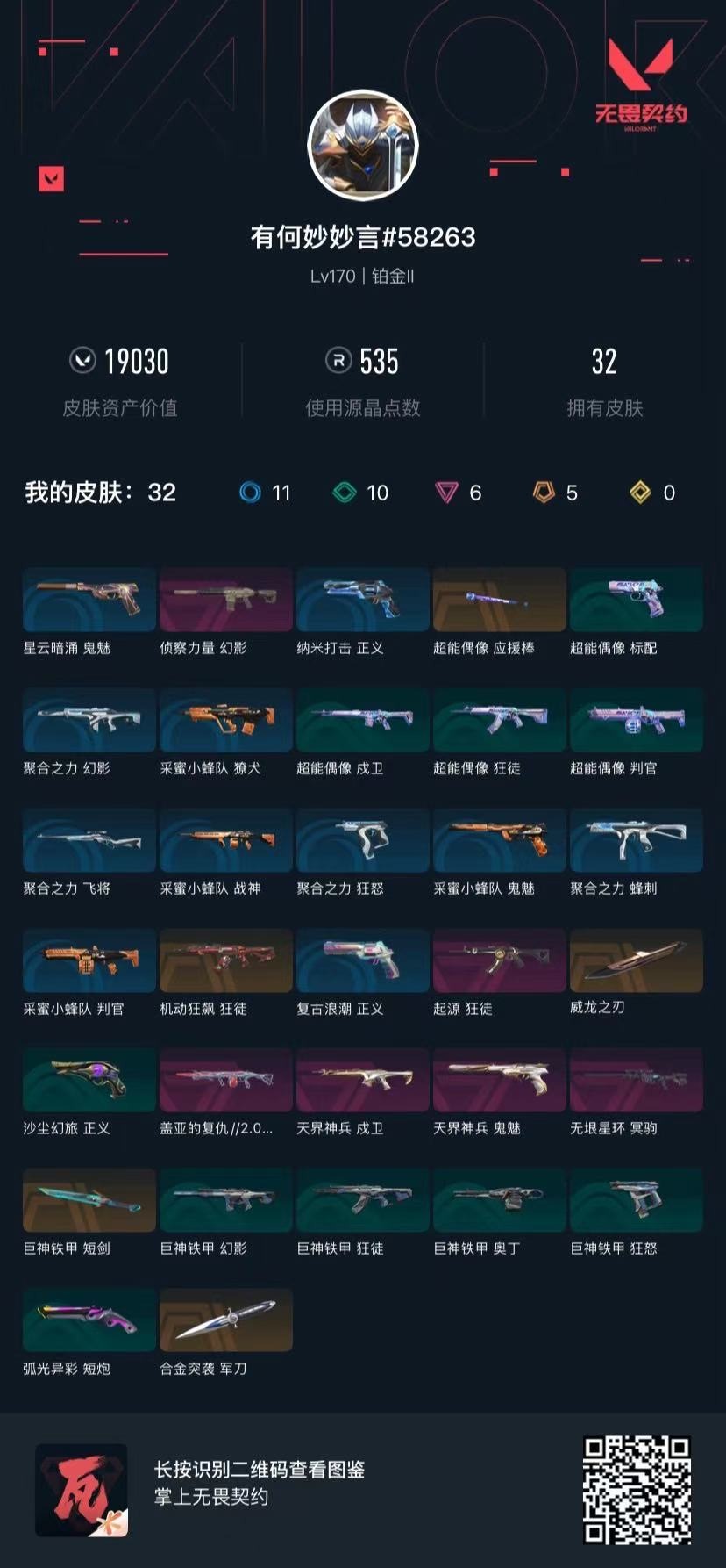 [16659670]5橙皮 6紫皮 32皮肤 27英雄 77卡面 535已用源晶 铂金段位 【套装】巨神铁甲套装 【近战武器皮肤】威龙之刃短剑-巨神铁甲超能偶像 应援棒军刀-合金突袭 【佩呛皮肤】鬼魅-天界神兵 【步呛皮肤】狂徒-机动狂飙狂徒-起源幻影-侦察力量戍卫-天界神兵 【狙击呛皮肤】冥驹-无垠星环 【机呛皮肤】战神-盖亚的复仇2.0 【挂饰】超能偶像挂饰袖珍捷风挂饰源晶工程挂饰传世莲华挂饰致命一击挂饰双城之战小蛋糕挂饰冬日絮语挂饰糖葫芦挂饰幸运中国结挂饰高音谱号挂饰
