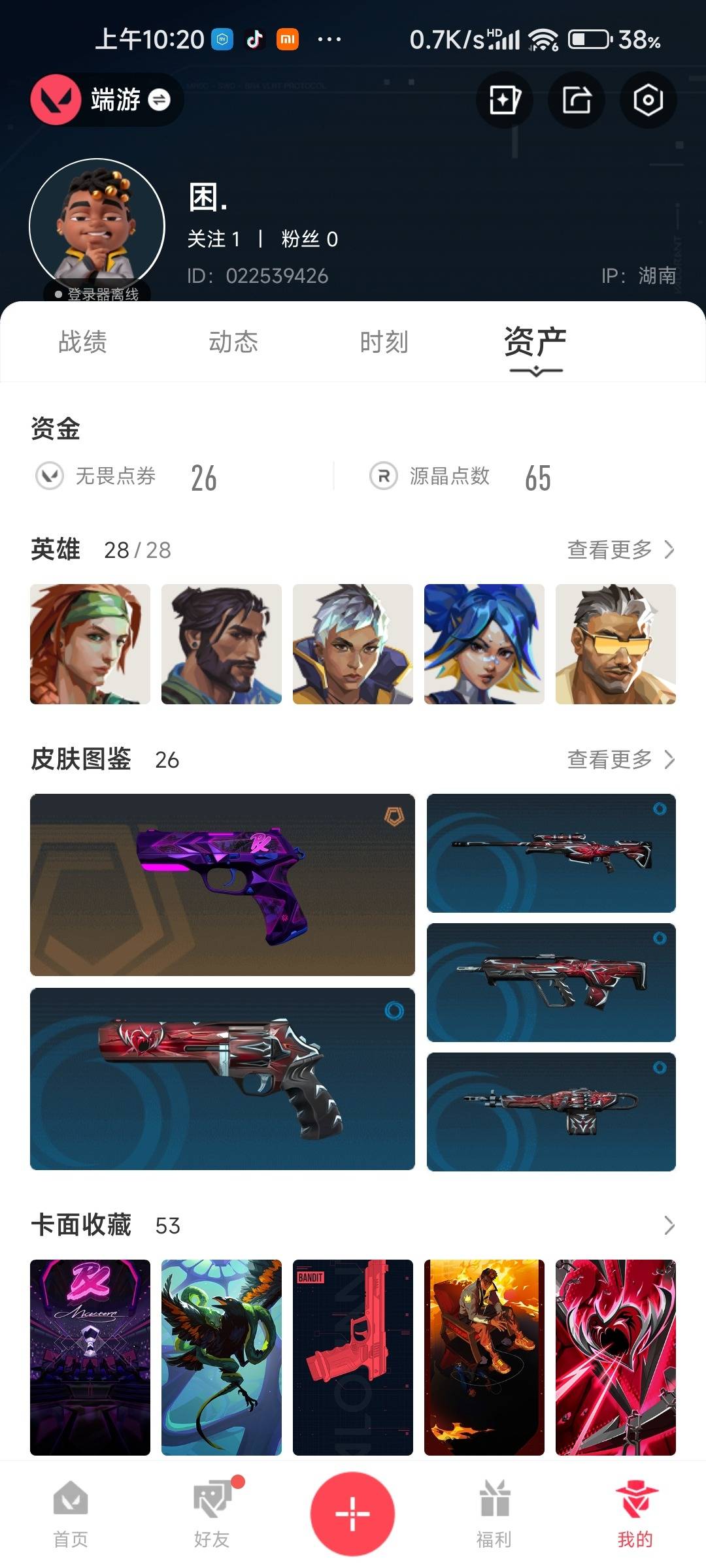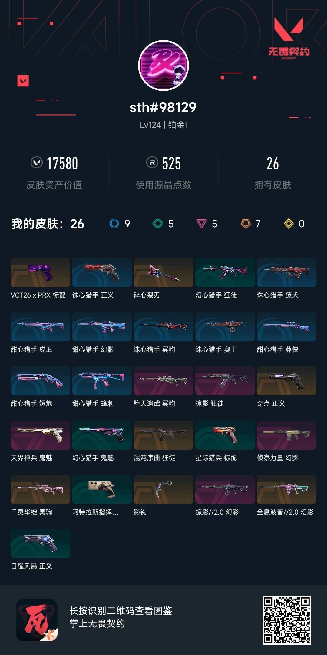 7橙皮 5紫皮 26皮肤 28英雄 53卡面 525已用源晶 铂金段位 【近战武器皮肤】影钩碎心裂刃 【佩呛皮肤】标配-vct26 x prx正义-奇点鬼魅-天界神兵 【步呛皮肤】狂徒-掠影幻影-掠影2.0狂徒-混沌序曲幻影-侦察力量幻影-全息波普//2.0 【狙击呛皮肤】冥驹-堕天