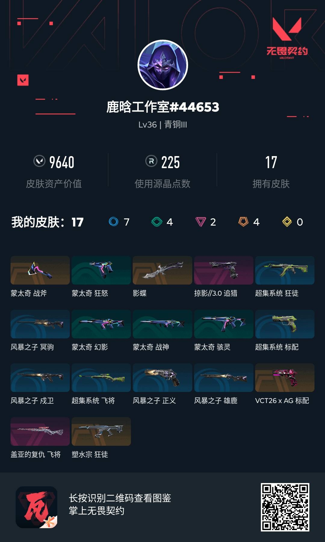 [16669225]s193561 (掠影//3.0套装)无畏契约/35等级/青铜段位/14英雄/17皮肤/资产9640/已使用r点225/剩余r点15/掠影//3.0-追猎,影蝶,蒙太奇-战斧,塑水宗-狂徒,盖亚的复仇-飞将,vct26-x-ag-标配