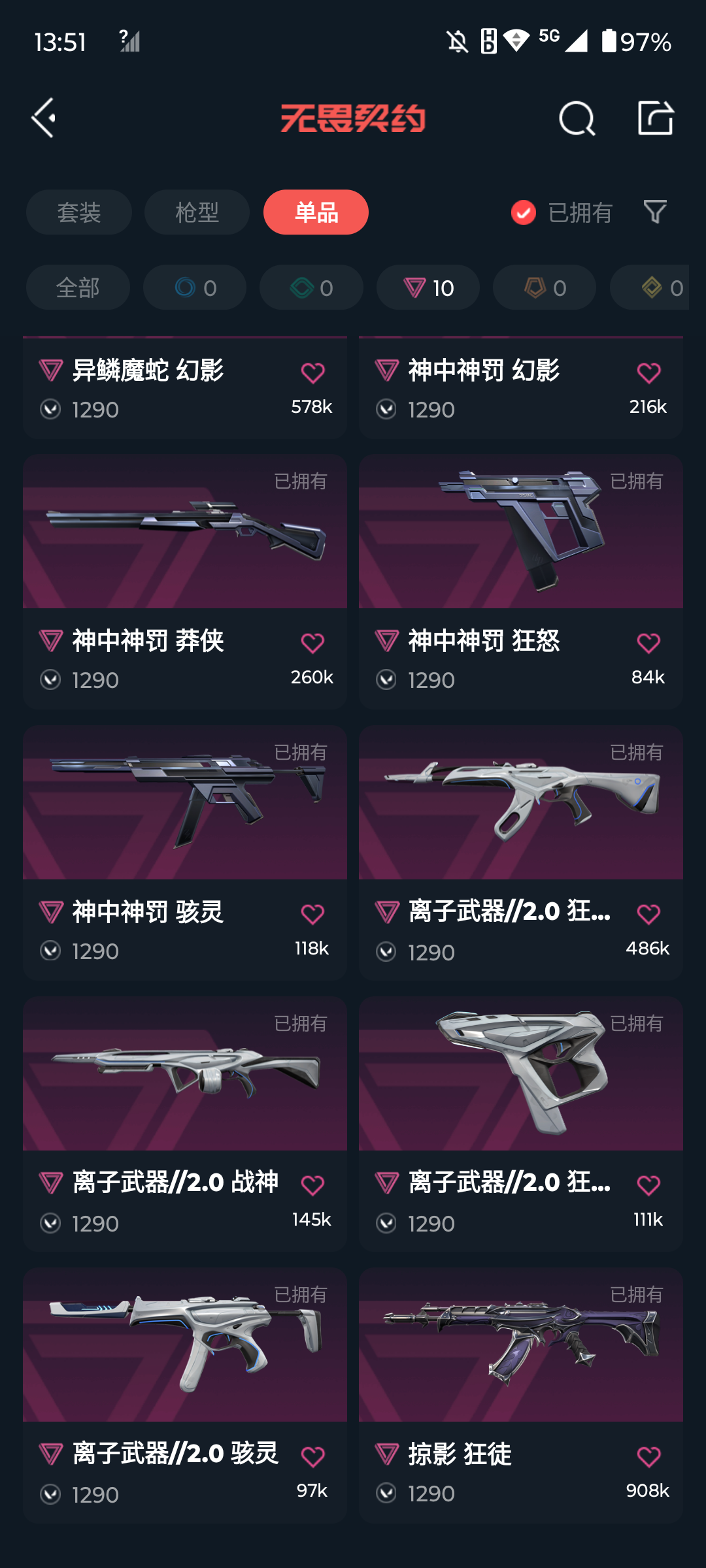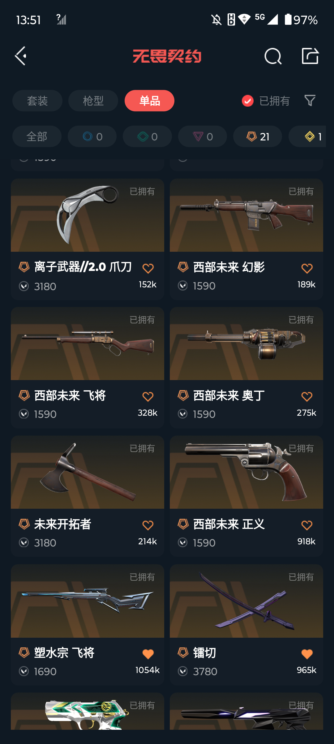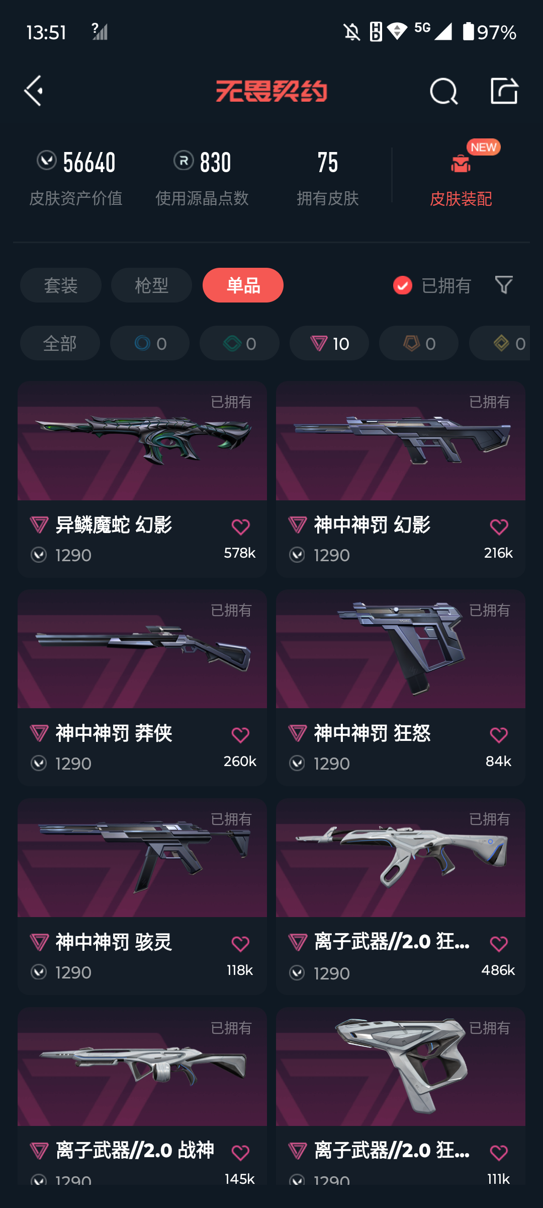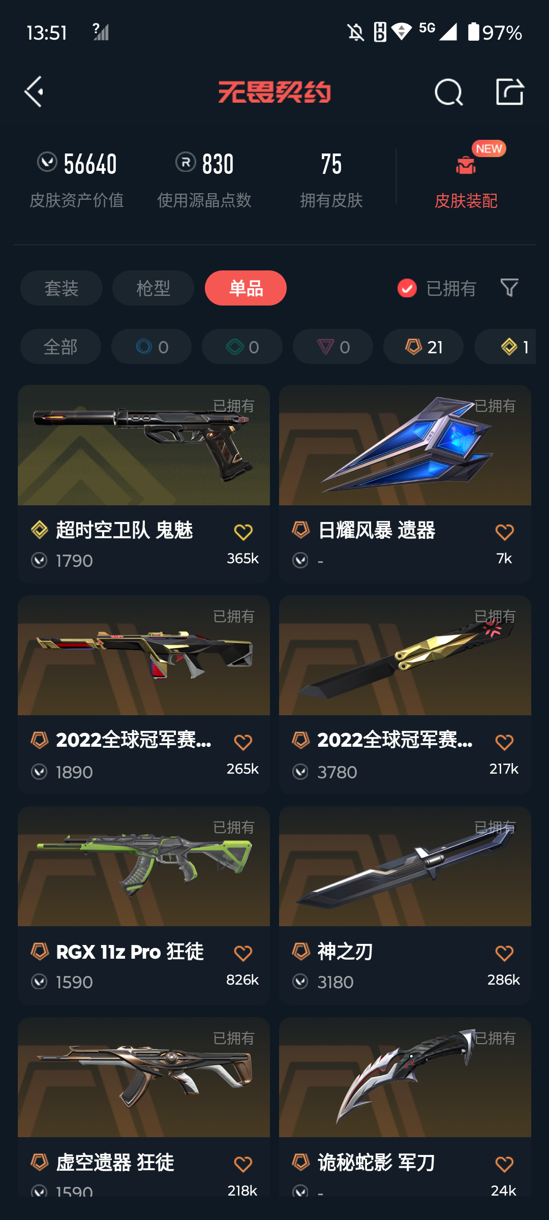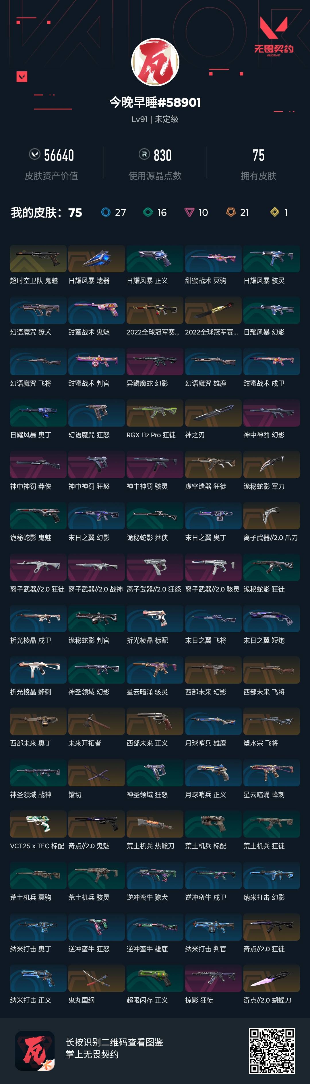 [16671194]s191544 (2022全球冠军赛套装/离子武器//2.0套装/神中神罚套装/西部未来套装/奇点2.0套装)无畏契约/91等级/未定级/27英雄/75皮肤/资产56640/已使用r点830/剩余r点30/2022全球冠军赛-幻影2022全球冠军赛-蝴蝶刀, rgx-11z-pro-狂徒,虚空遗器-狂徒,异鳞魔蛇-幻影,掠影-狂徒,日耀风暴-遗器,诡秘蛇影-军刀,荒土机兵-热能刀,镭切,鬼丸国纲,塑水宗-飞将,vct25-x-tec-标配,超时空卫队-鬼魅
