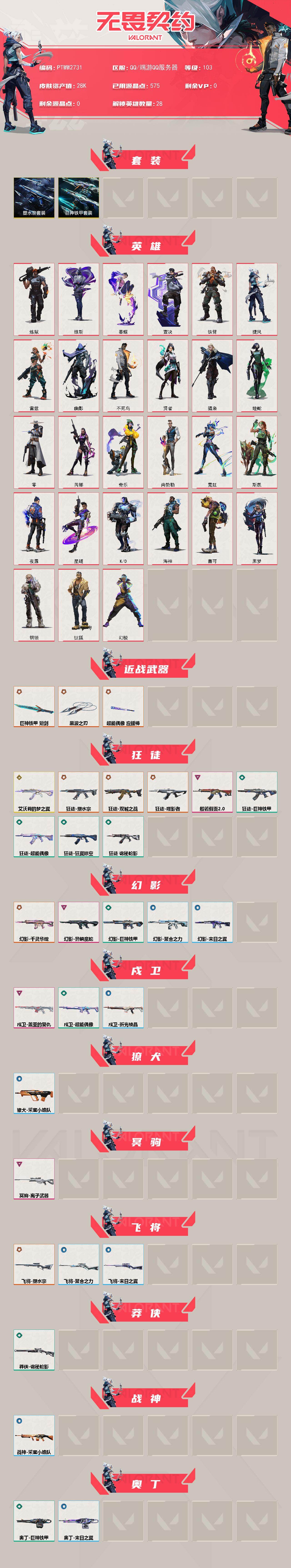 【套装】:塑水宗套装,巨神铁甲套装 【英雄】:幻棱,炼狱,维斯,暮蝶,钛狐,壹决,铁臂,捷风,雷兹,幽影,不死鸟,贤者,猎枭,蝰蛇,零,芮娜,奇乐,尚勃勒,霓虹,斯凯,夜露,星礈,k/o,海神,盖可,黑梦,钢锁 【近战武器】:近战武器-黑波之刃,近战武器-巨神铁甲 短剑,近战武器-超能偶像 应援棒 【狂徒】:狂徒-艾沃莉的梦之翼,狂徒-双城之战,狂徒-塑水宗,狂徒-噬影者,狂徒-般若假面//2