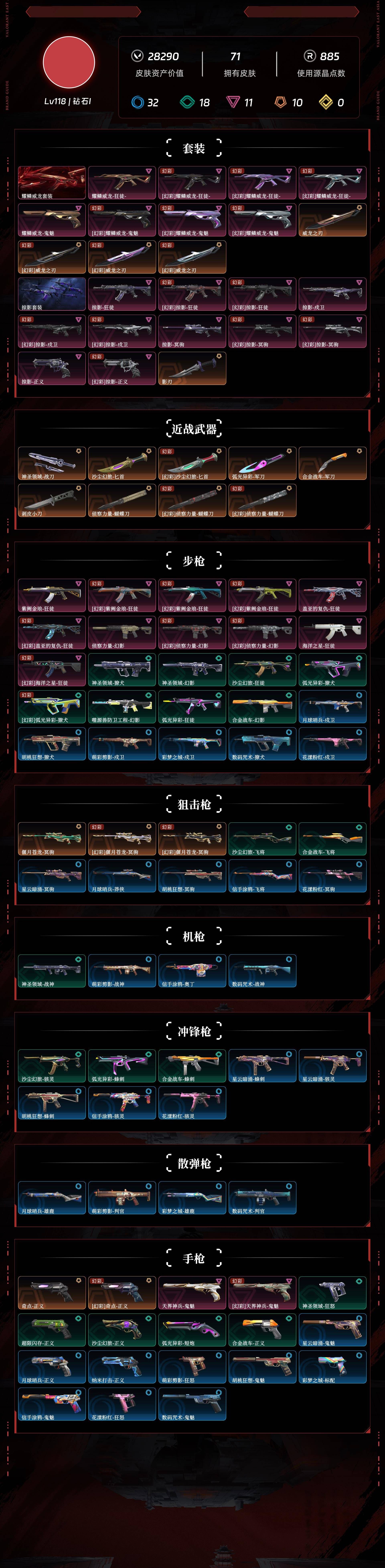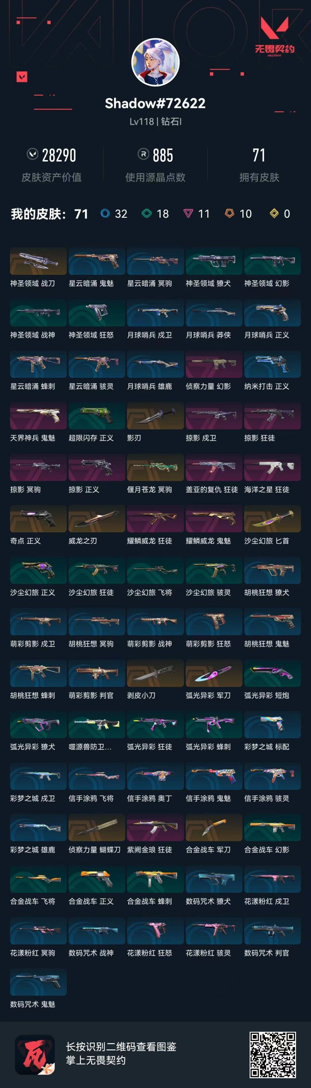[9135863]r22692,有二次,剩余点券:76, lv118 ,皮肤总价值28290,钻石i,总皮肤71,刀皮8呛皮63传奇2卓越11,套装2卓越2,耀鳞威龙套装,具体详情看图