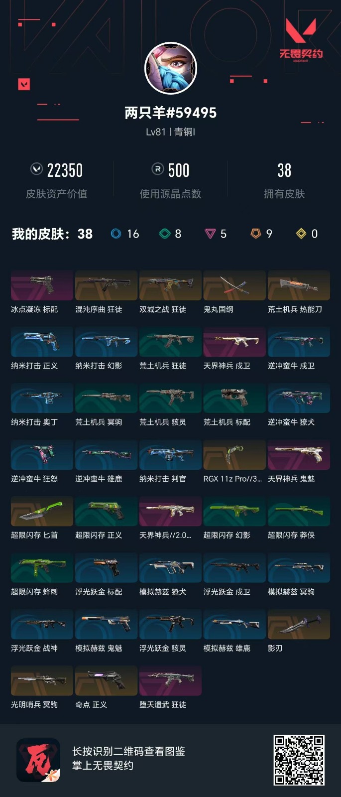 [9148676]9橙皮 5紫皮 38皮肤 21英雄 68卡面 500已用源晶 青铜 佩呛皮肤:正义-奇点鬼魅-天界神兵标配-冰点凝冻 步呛皮肤:狂徒-双城之战狂徒-混沌序曲狂徒-堕天遗武幻影-天界神兵2.0戍卫-天界神兵 狙击呛皮肤:冥驹-光明哨兵 近战武器皮肤:鬼丸国纲荒土机兵热能刀影刃匕首-超限闪存爪刀-rgx 11z pro 3.0